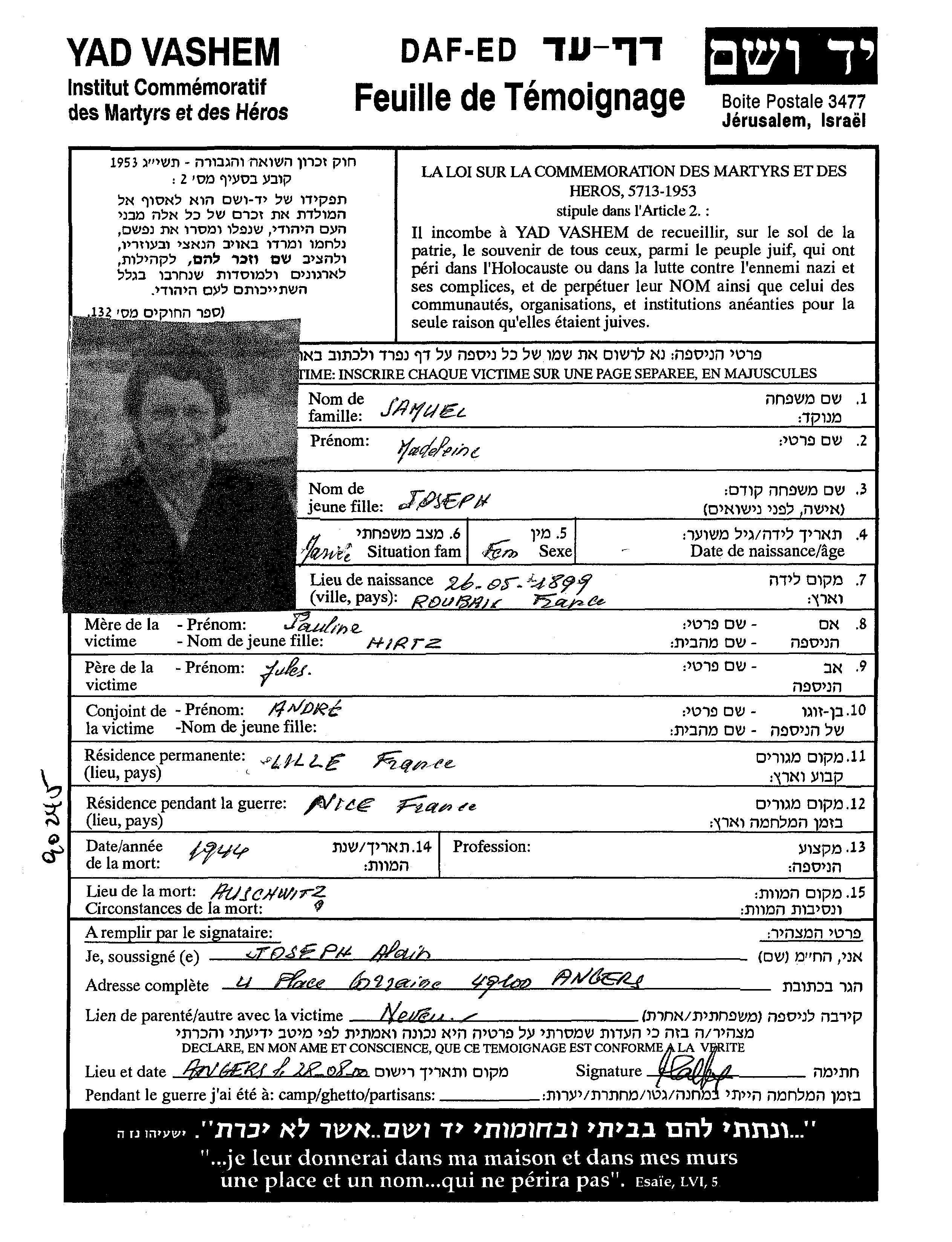 Madeleine Samuel, geb. Joseph wurde im Jahr 1899 in Roubaix, Frankreich geboren. Vor dem Zweiten Weltkrieg lebte sie in Lille, Frankreich.