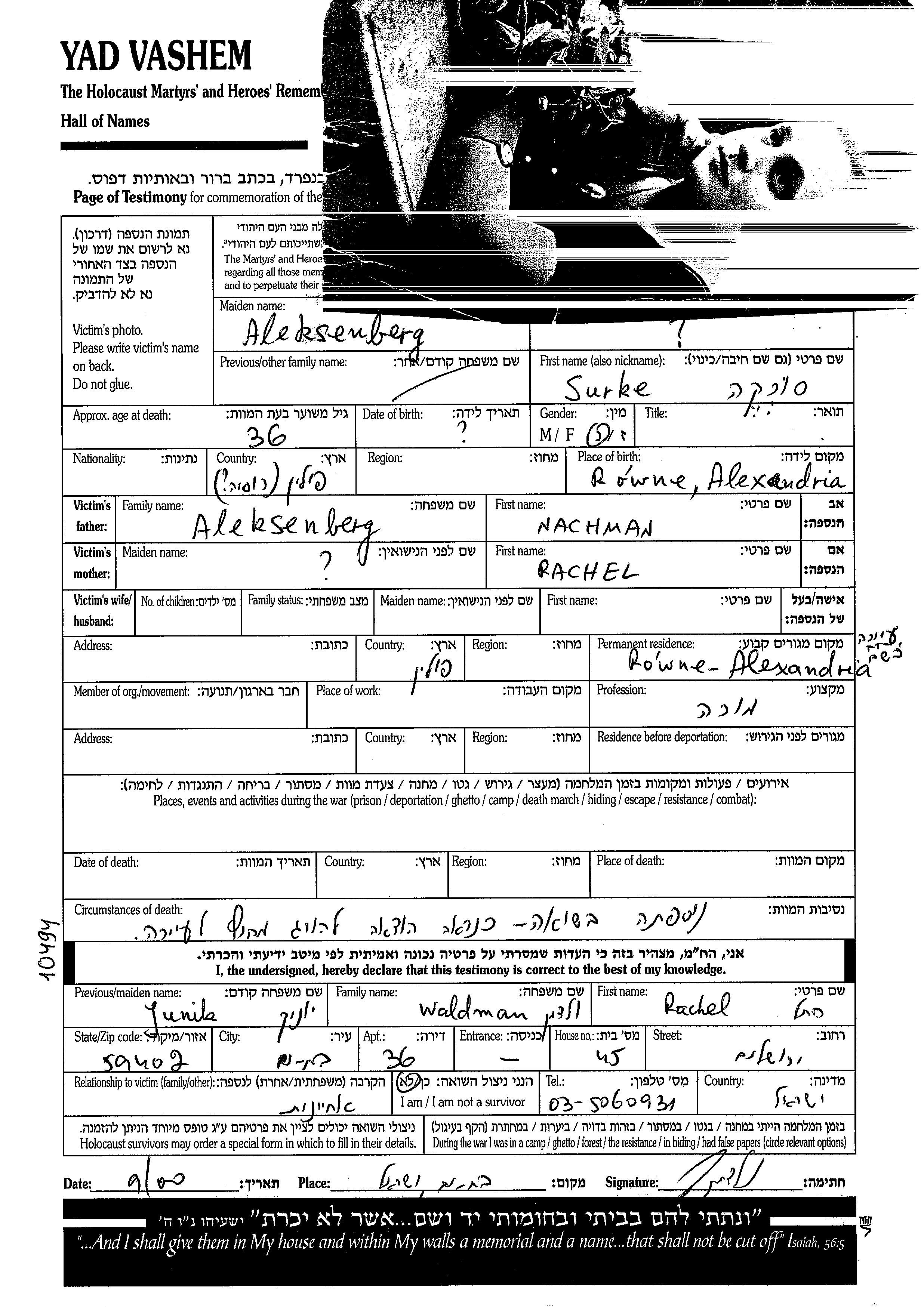 Surke Name unbekannt, geb. Aleksenberg wurde in Aleksandrja, Polen geboren. Sie war Lehrer/in. Vor dem Zweiten Weltkrieg lebte sie in Aleksandrja, Polen.