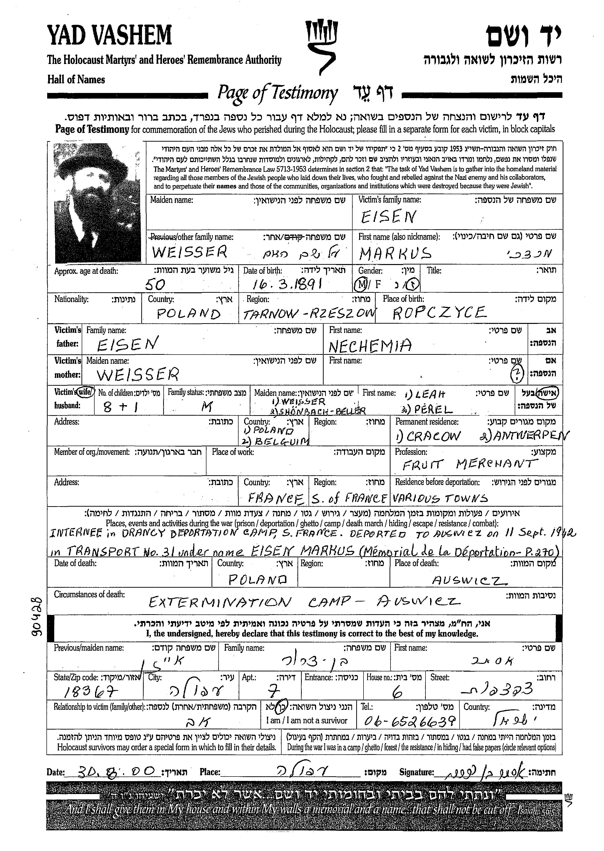 Mordekhai Markus wurde in der Schoah ermordet. Todesort: Auschwitz, Polen im Jahr 1942.