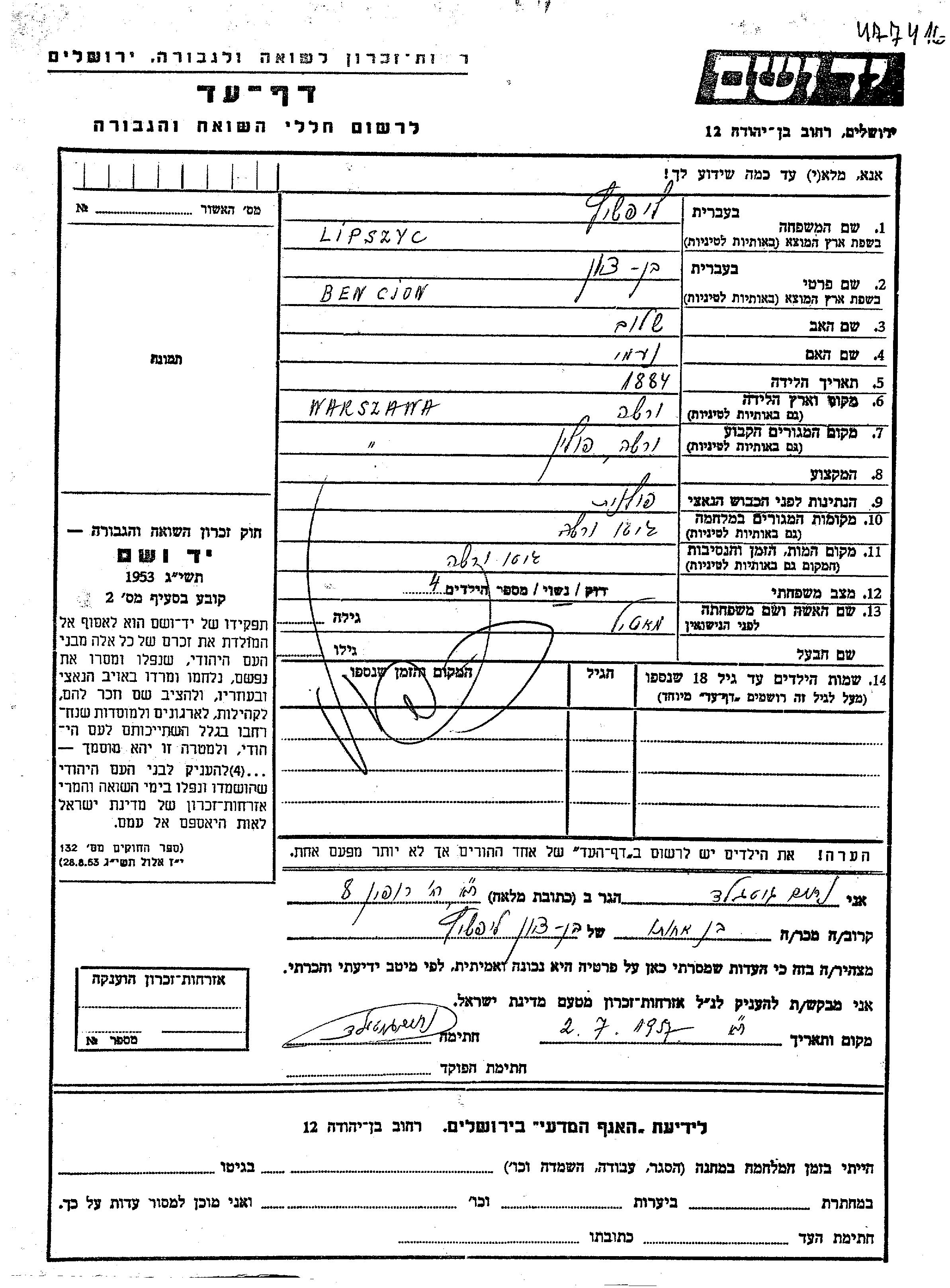 Bencion Lipszyc wurde im Jahr 1884 in Warszawa, Polen geboren. Er war der Sohn von Shalom und Naomi. Er war mit Matil Verheiratet. Vor dem Zweiten Weltkrieg lebte er in Warszawa, Polen. Während des Krieges war er in Warszawa, Polen.