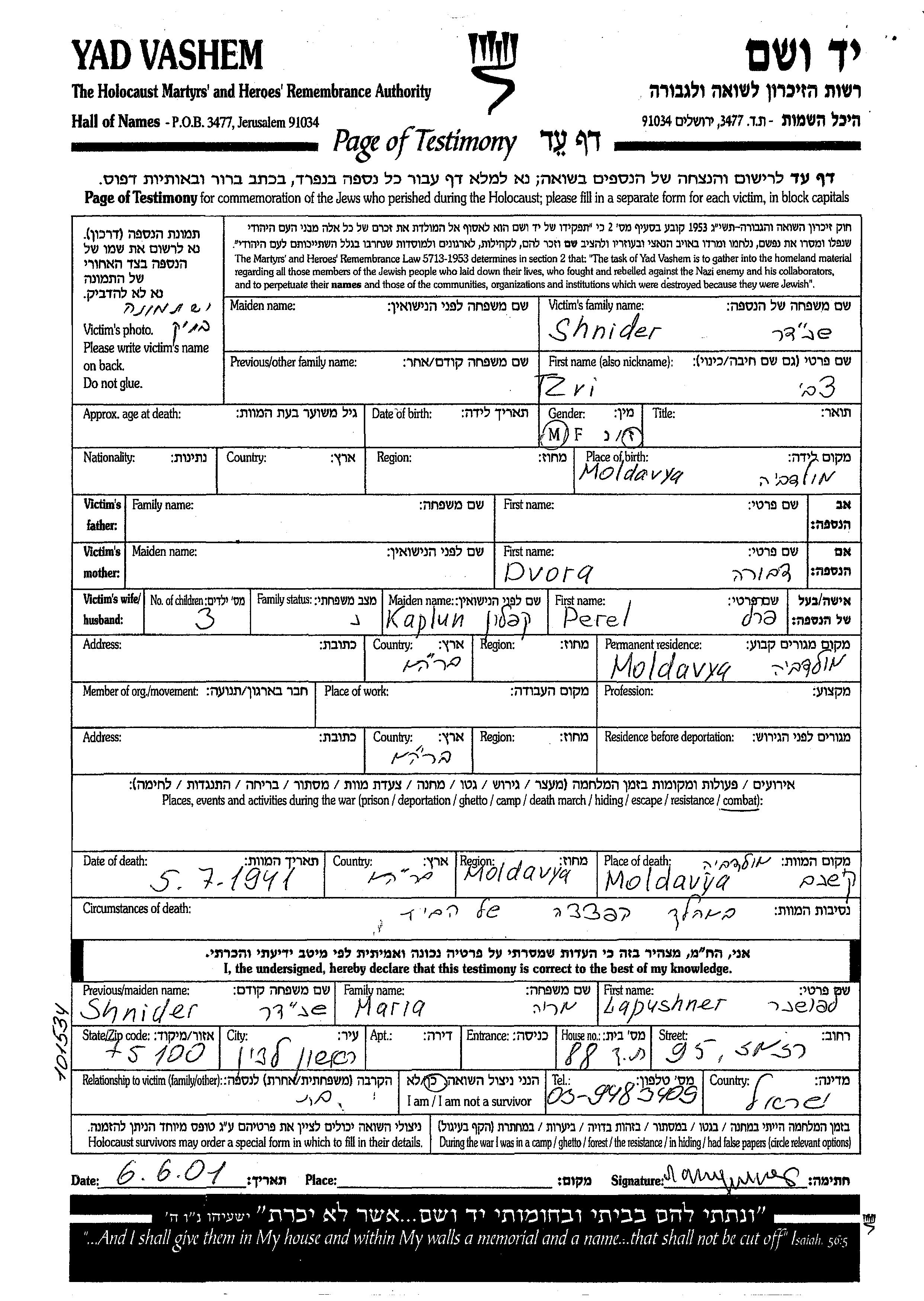 Zvi Shnider wurde in Moldavia, Rumänien geboren. Vor dem Zweiten Weltkrieg lebte er in Moldavia, Rumänien.