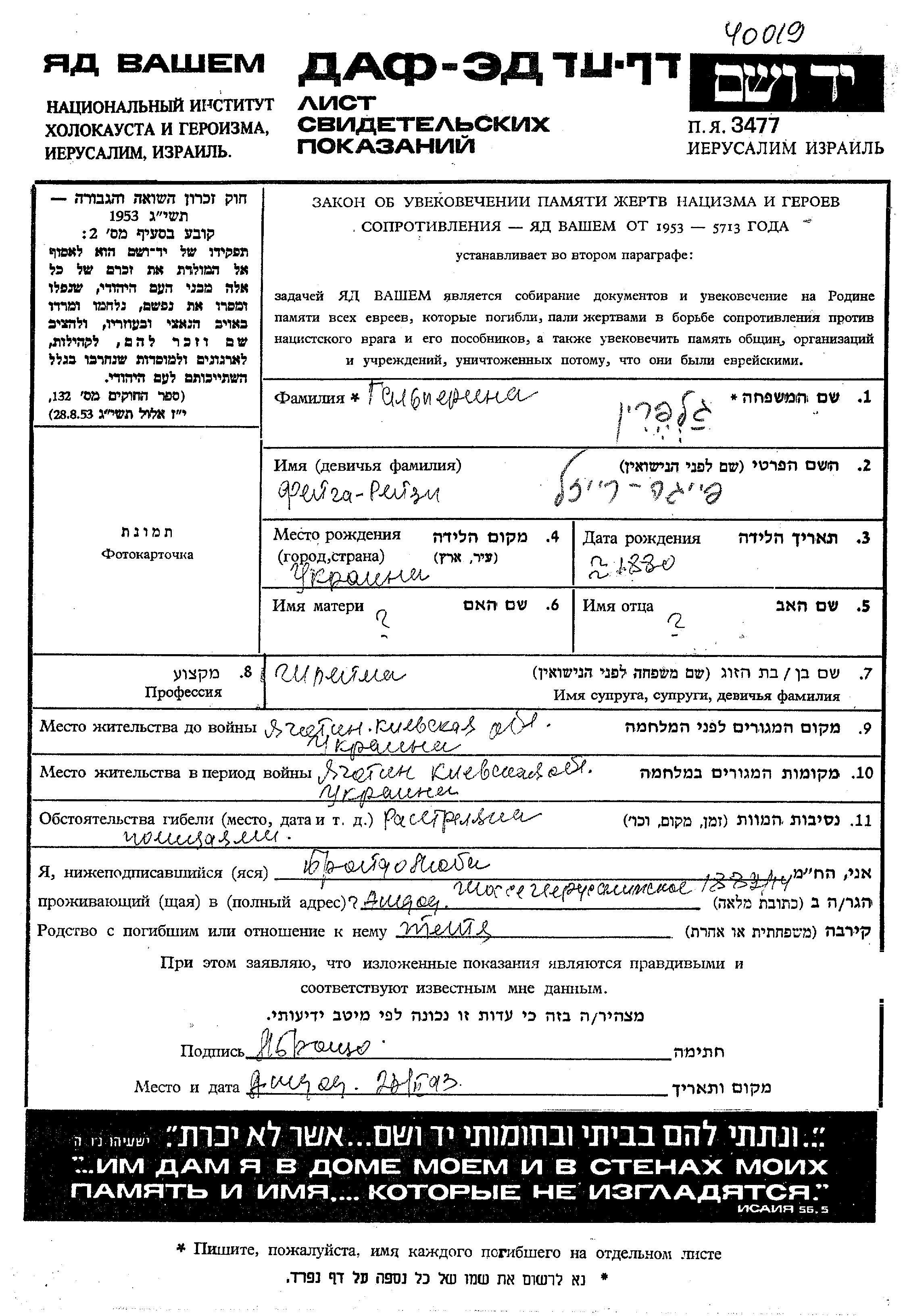 Reizl Feiga Galperin wurde im Jahr 1880 in Ukraine (UdSSR) geboren. Sie war mit Shleima Verheiratet. Vor dem Zweiten Weltkrieg lebte sie in Yagotin, Ukraine (UdSSR). Während des Krieges war sie in Yagotin, Ukraine (UdSSR).