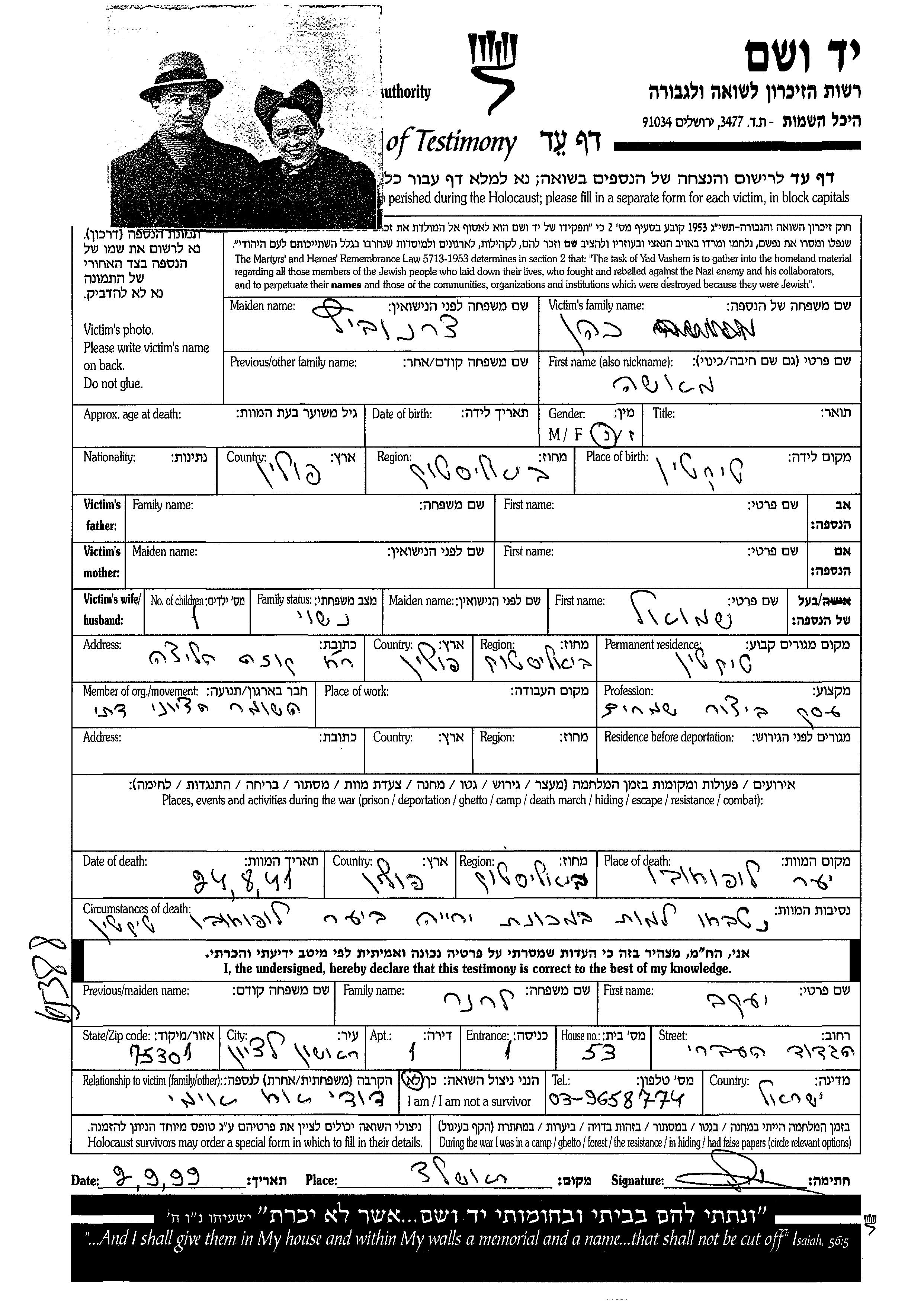 Masha Kohen, geb. Chernovich Chekhanovitz wurde in Tykocin, Polen geboren. Sie war יצור שמרים. Vor dem Zweiten Weltkrieg lebte sie in Tykocin, Polen. Masha wurde in der Schoah ermordet. Todesort: Lopuchowo, Polen im Jahr 1941.