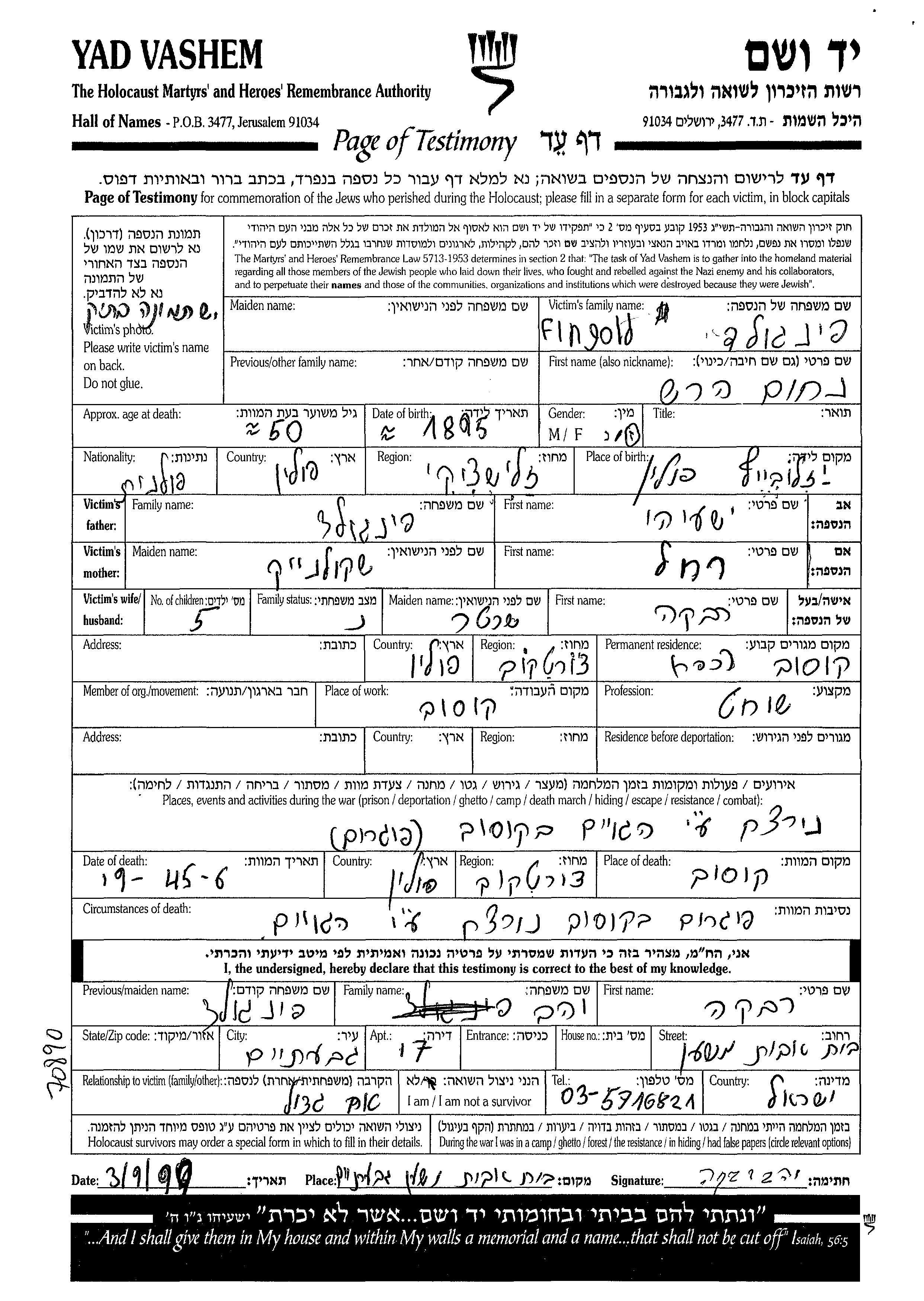 Nakhum Hersh Fingold wurde im Jahr 1895 in Jazlowiec, Polen geboren. Er war Schächter. Vor dem Zweiten Weltkrieg lebte er in Kosow, Polen.
