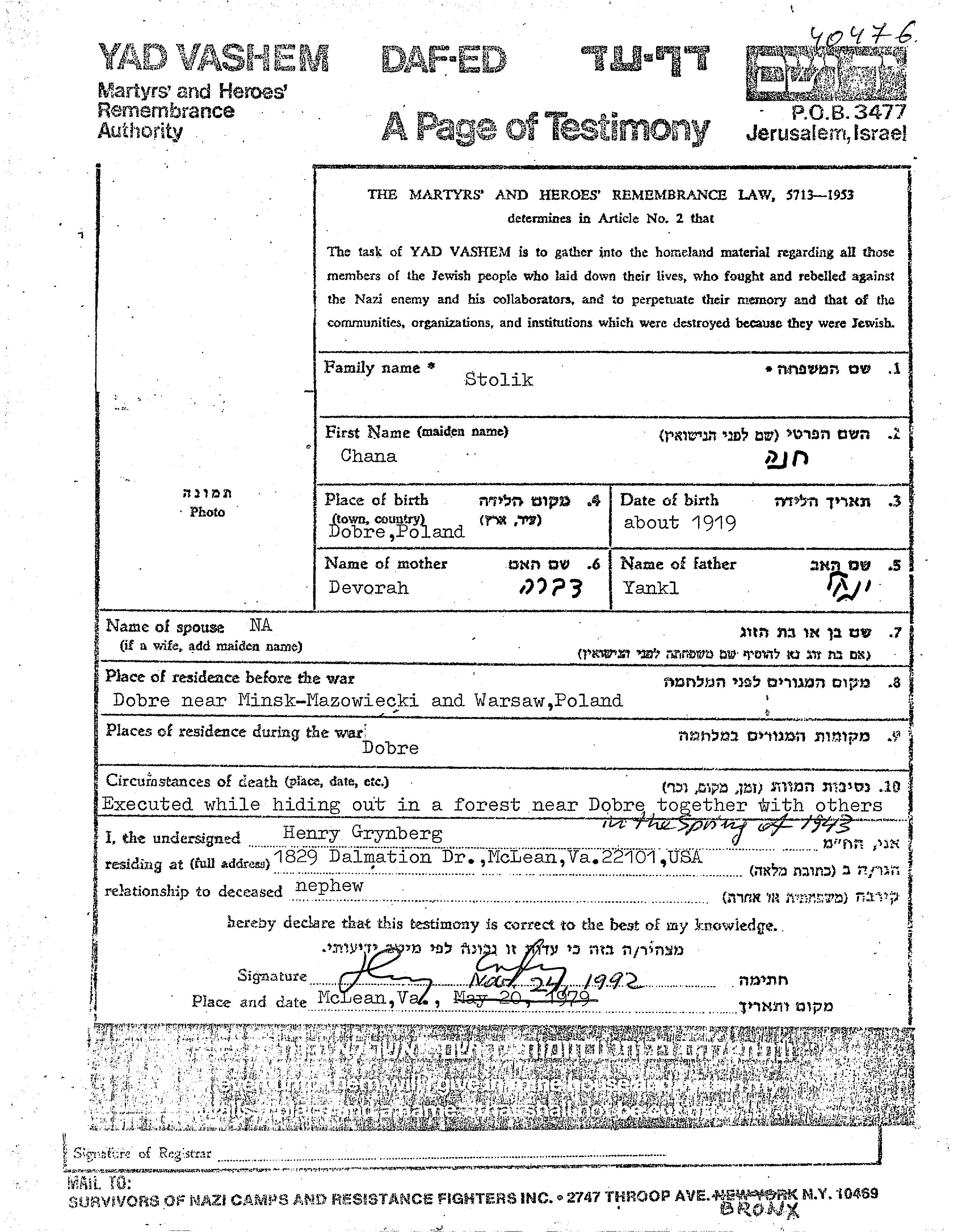 Chana Stolik wurde im Jahr 1919 in Dobre, Polen geboren. Sie war die Tochter von Yankl und Devorah, geb. Szczepanski. Sie war Ledig. Vor dem Zweiten Weltkrieg lebte sie in Dobre, Polen. Während des Krieges war sie in Dobre, Polen.