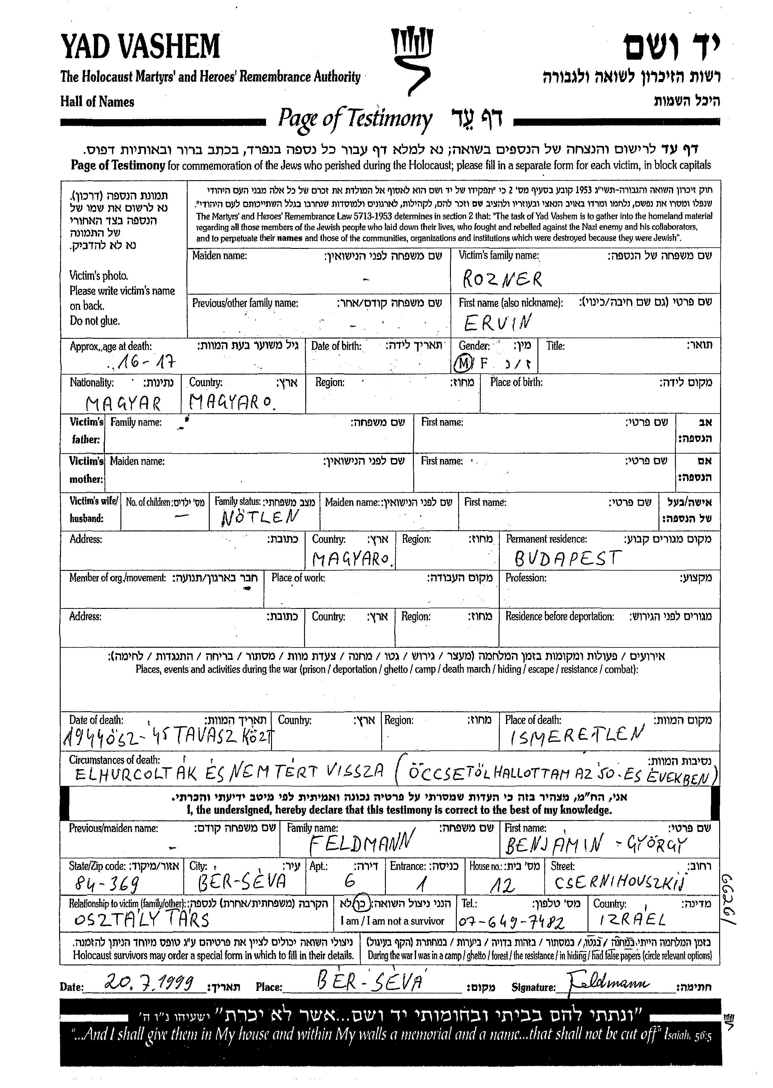 Rozner Ervin Budapest, Ungarn Gedenkblatt