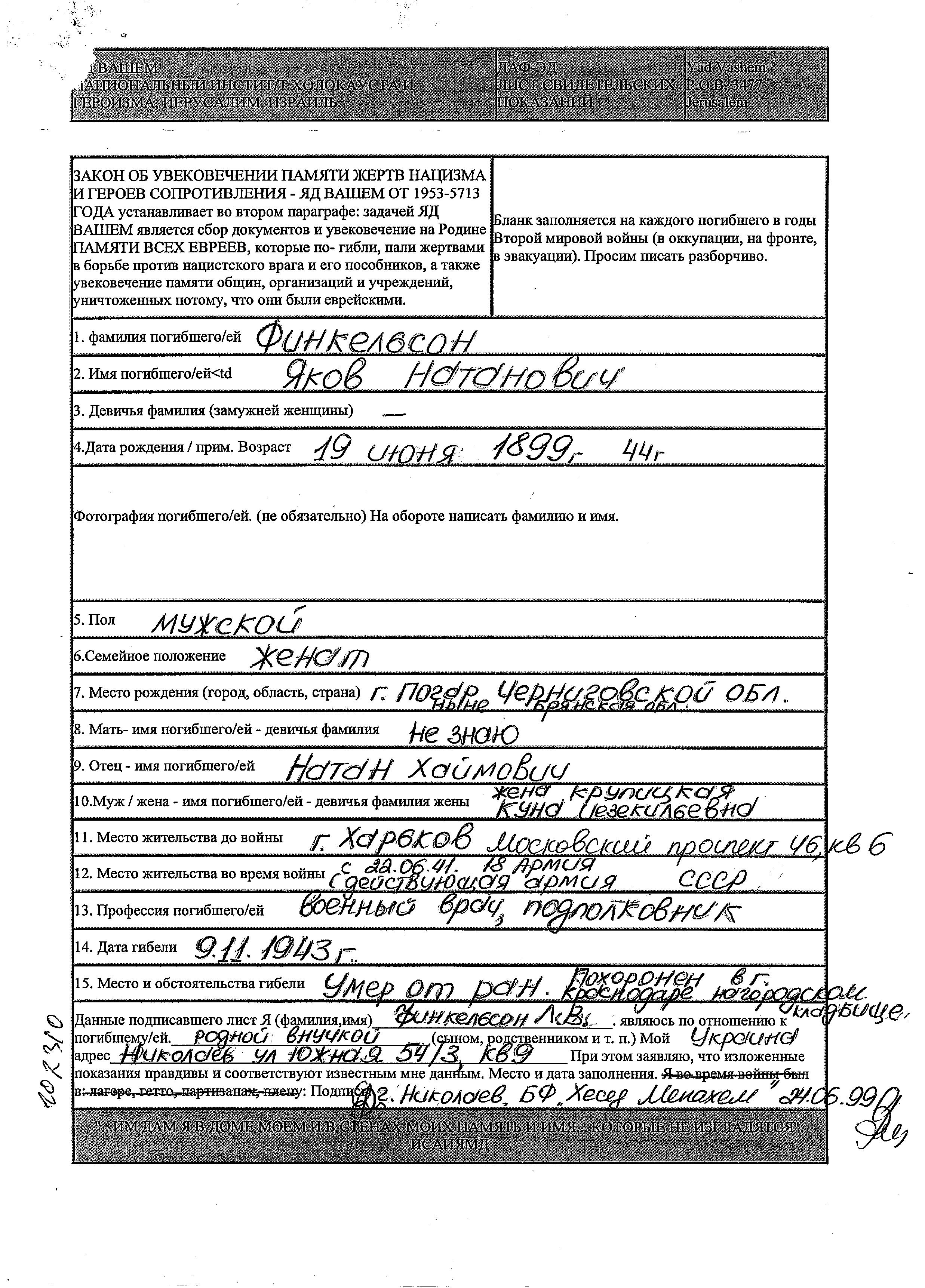 Yakov Finkelson wurde im Jahr 1899 in Pogar, Russland (UdSSR) geboren. Er war Militärarzt. Vor dem Zweiten Weltkrieg lebte er in Kharkov, Ukraine (UdSSR).