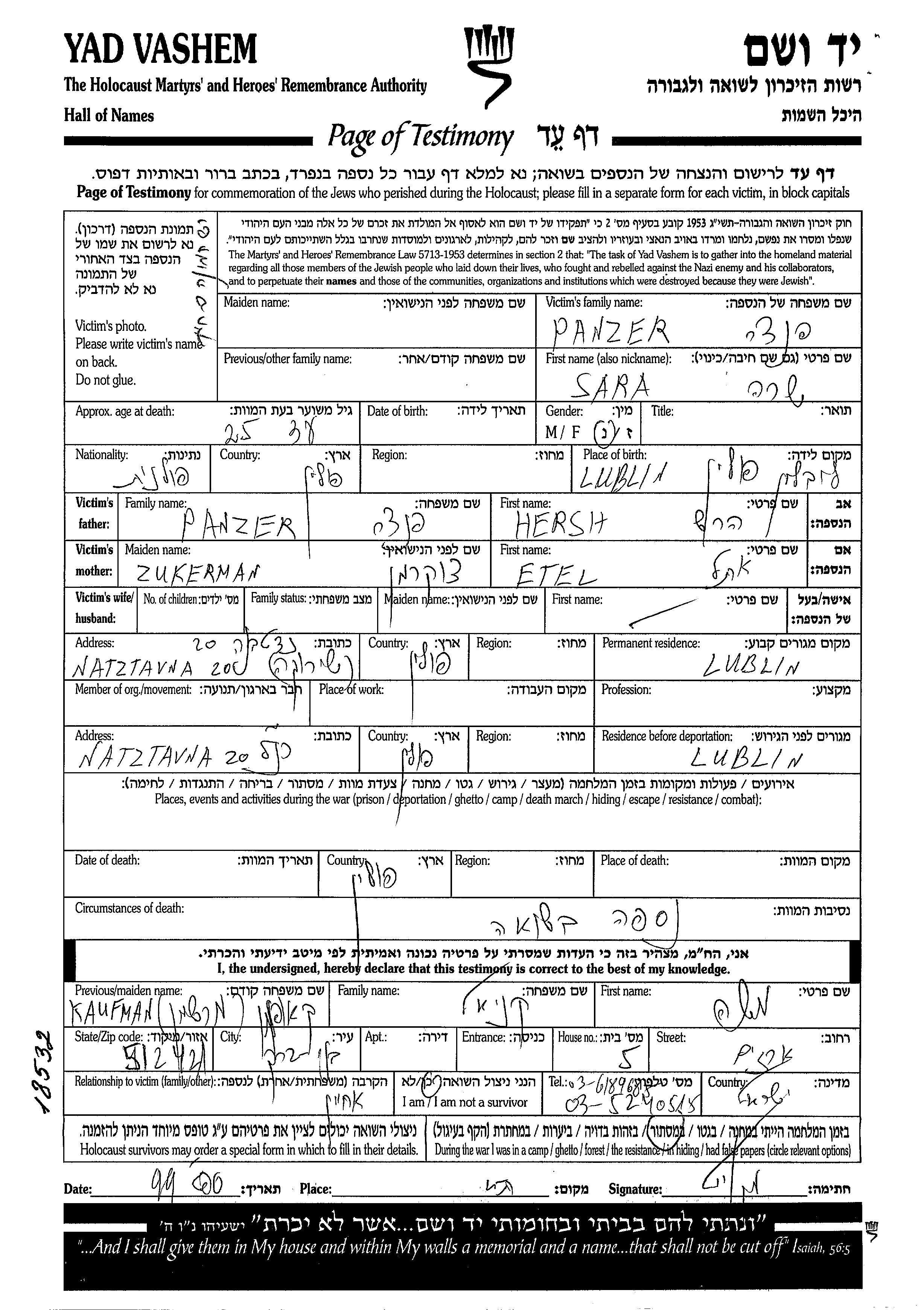 Sara Panzer Pantzer wurde in Lublin, Polen geboren. Vor dem Zweiten Weltkrieg lebte sie in Lublin, Polen.