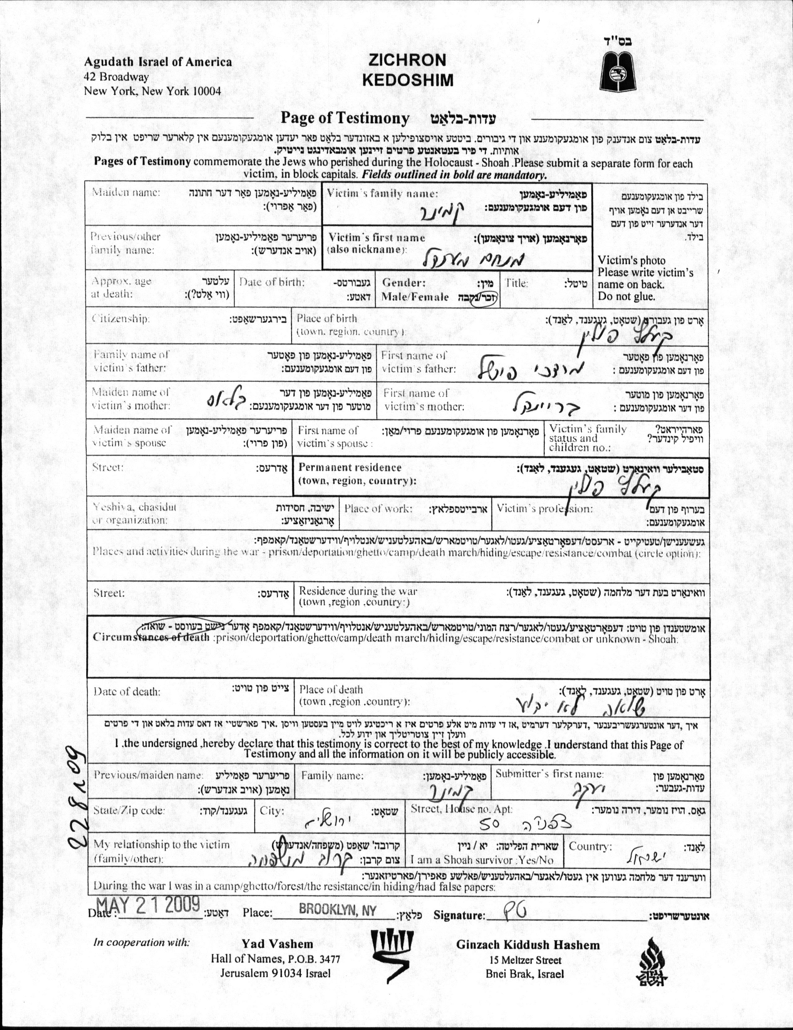 Kaminer Menakhem Mendl Kielce, Polen Gedenkblatt