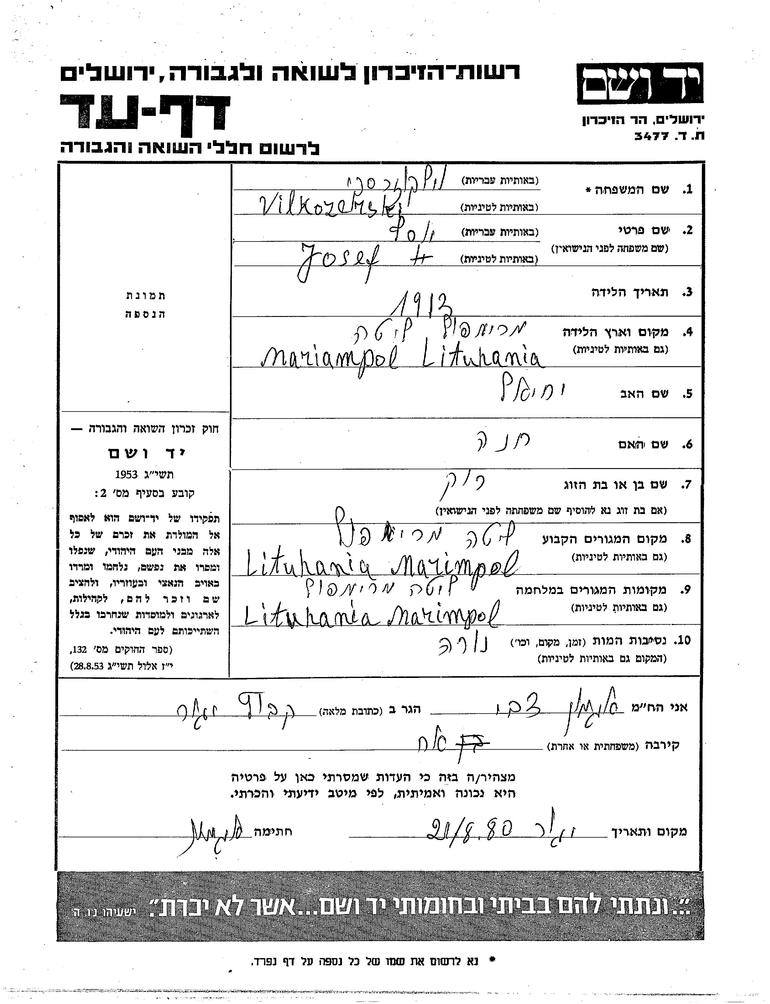 Josef Vilkozerski wurde im Jahr 1913 in Marijampole, Litauen geboren. Vor dem Zweiten Weltkrieg lebte er in Marijampole, Litauen.