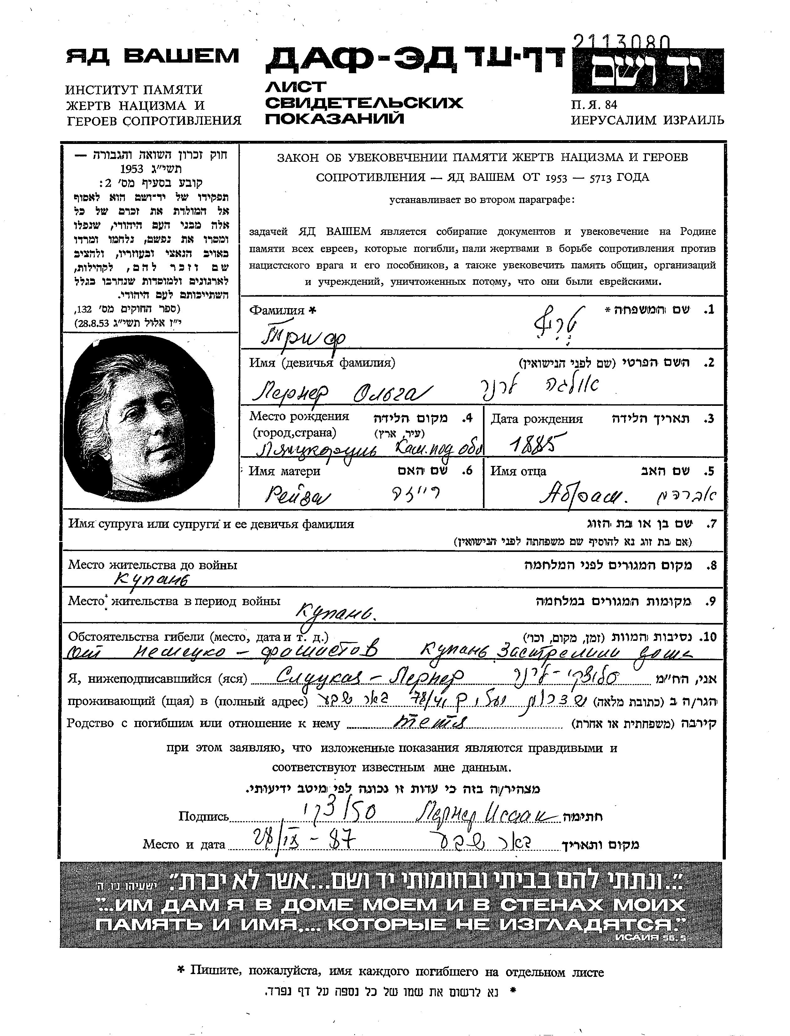 Olga wurde in der Schoah ermordet. Todesort: Kupin, Ukraine (UdSSR).