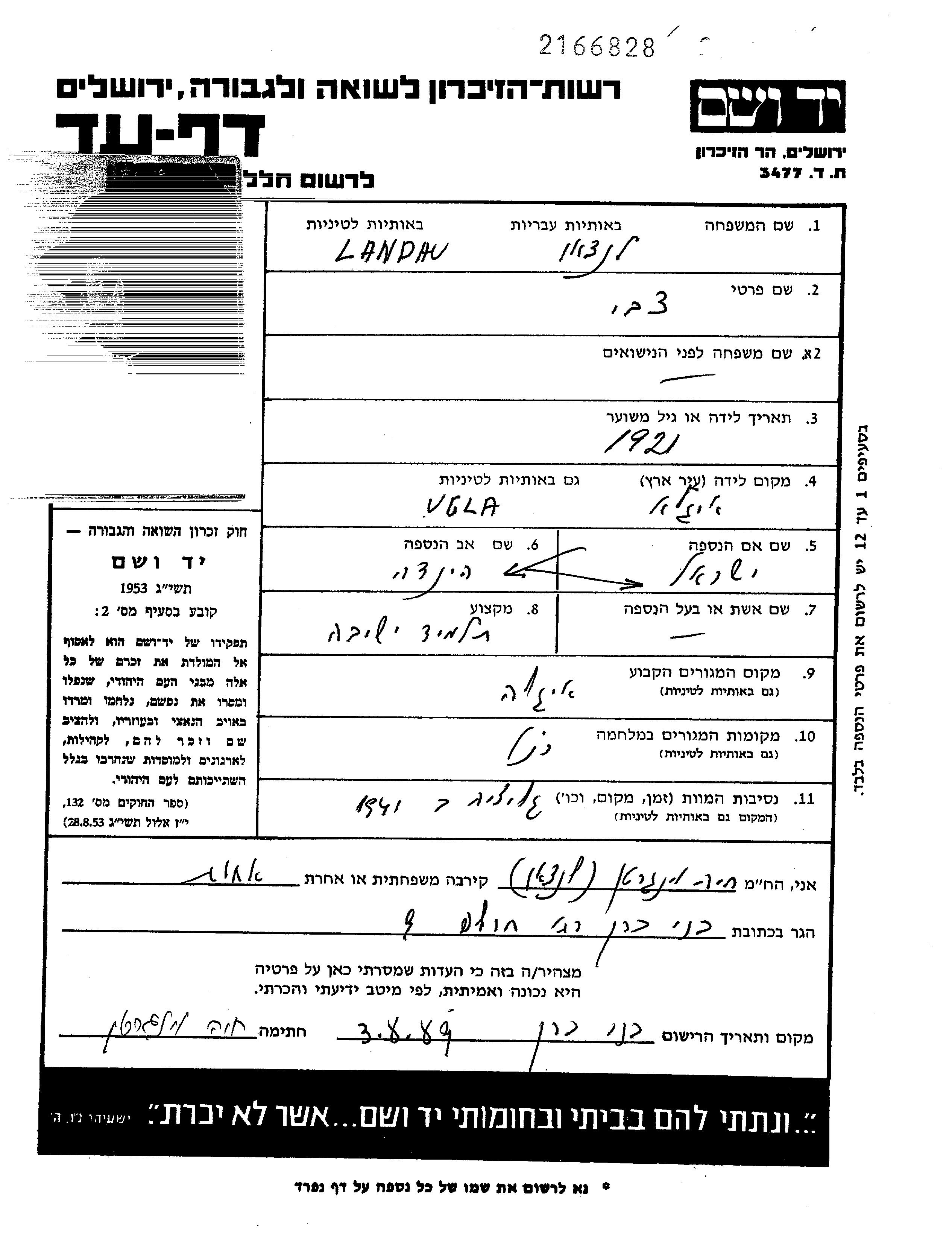 Tzvi Landau wurde im Jahr 1921 in Uhla, Tschechoslowakei geboren. Er war Jeschiwahschüler. Vor dem Zweiten Weltkrieg lebte er in Uhla, Tschechoslowakei.