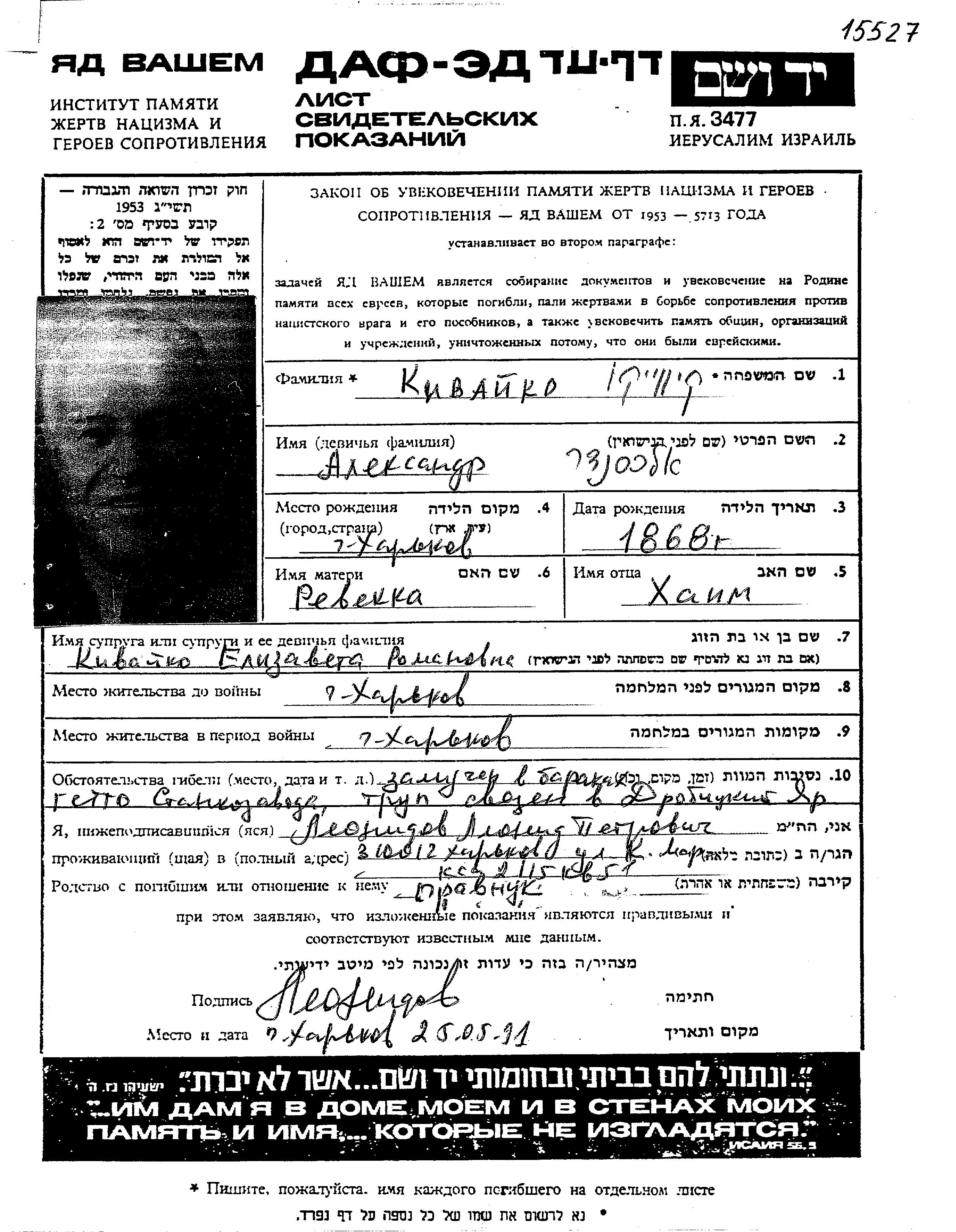 Aleksandr wurde in der Schoah ermordet. Todesort: Kharkov, Ukraine (UdSSR).