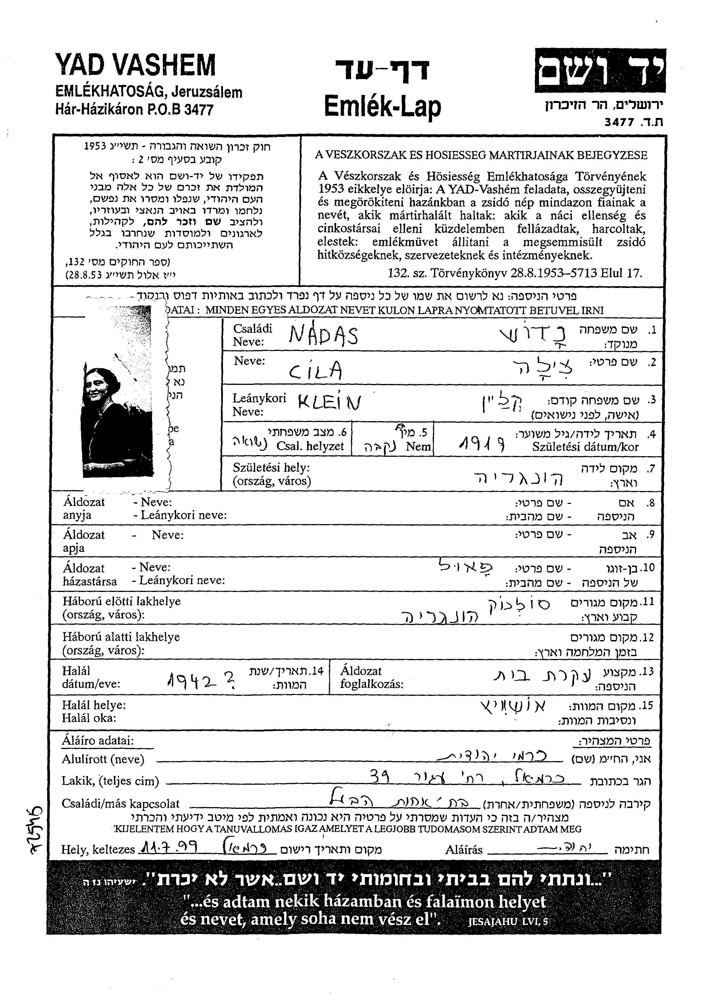 Cila Nadas Nadosh, geb. Klein wurde im Jahr 1919 in Ungarn geboren. Sie war Hausfrau. Vor dem Zweiten Weltkrieg lebte sie in Szolnok, Ungarn.