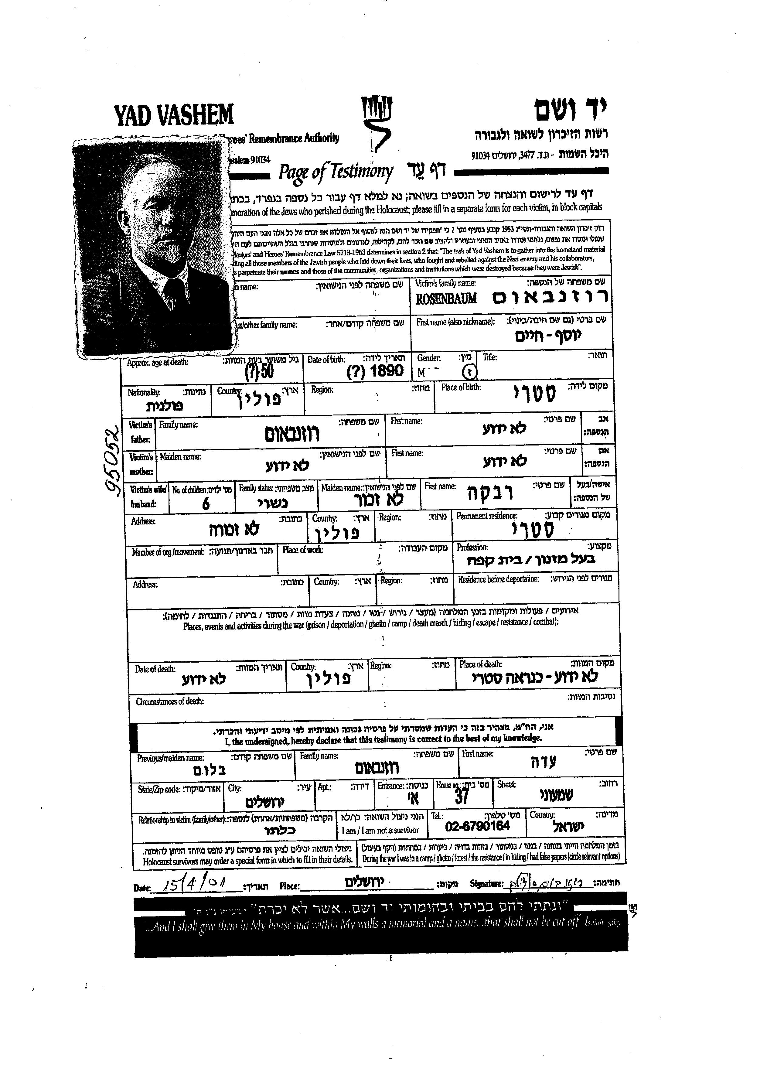 Yosef Khaim Rosenbaum wurde im Jahr 1890 in Stryj, Polen geboren. Er war Buffetbetreiber. Vor dem Zweiten Weltkrieg lebte er in Stryj, Polen.