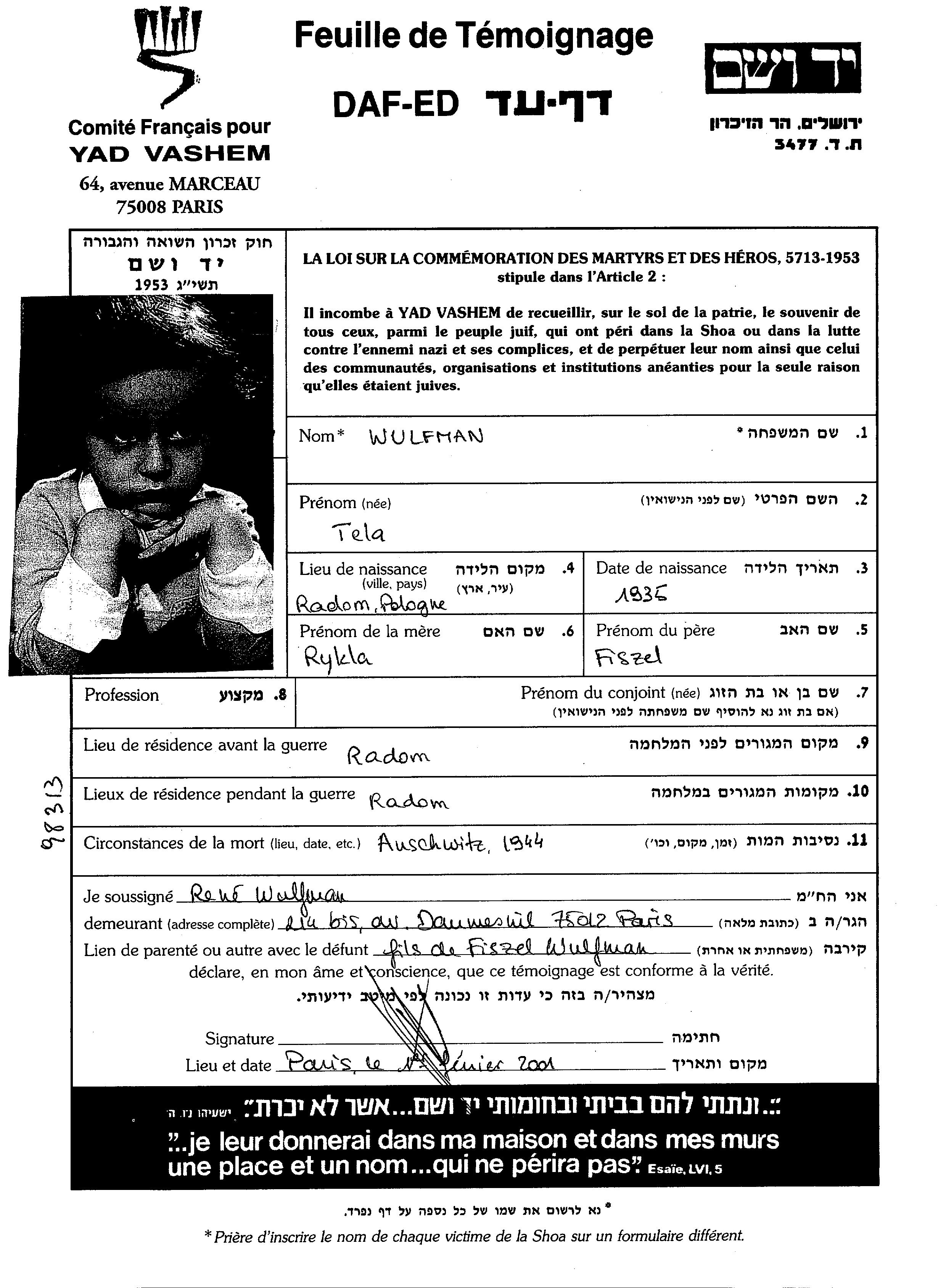 Tela Wulfman wurde im Jahr 1935 in Radom, Polen geboren. Vor dem Zweiten Weltkrieg lebte sie in Radom, Polen.