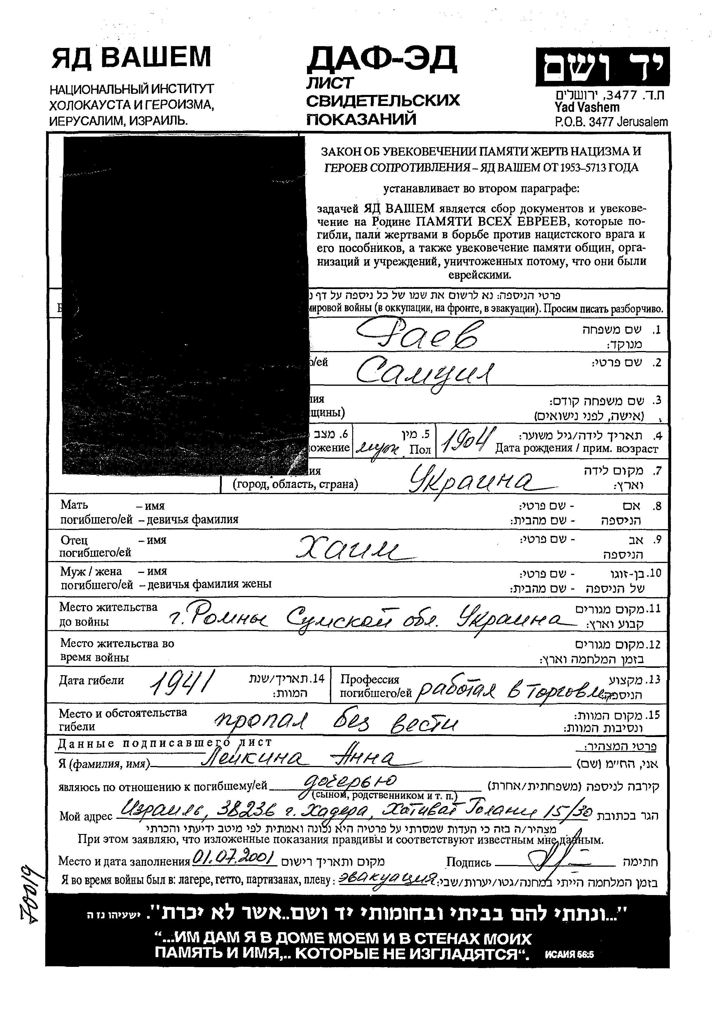 Samuil Rayev wurde im Jahr 1904 in Ukraine (UdSSR) geboren. Er war Handelsangestellter. Vor dem Zweiten Weltkrieg lebte er in Romny, Ukraine (UdSSR).