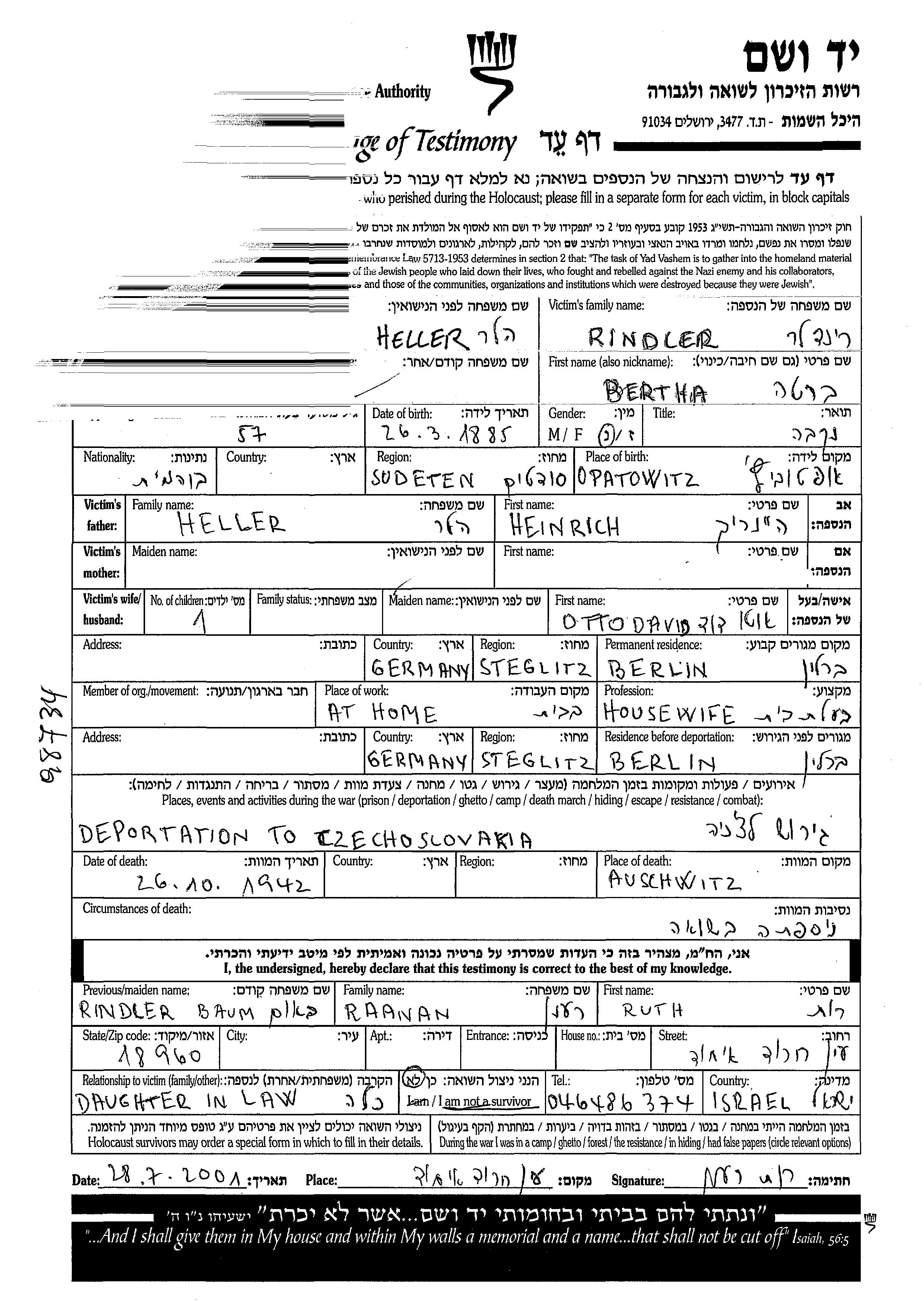 Rindler | Bertha | 1885 | Berlin, Deutsches Reich | Gedenkblatt |
