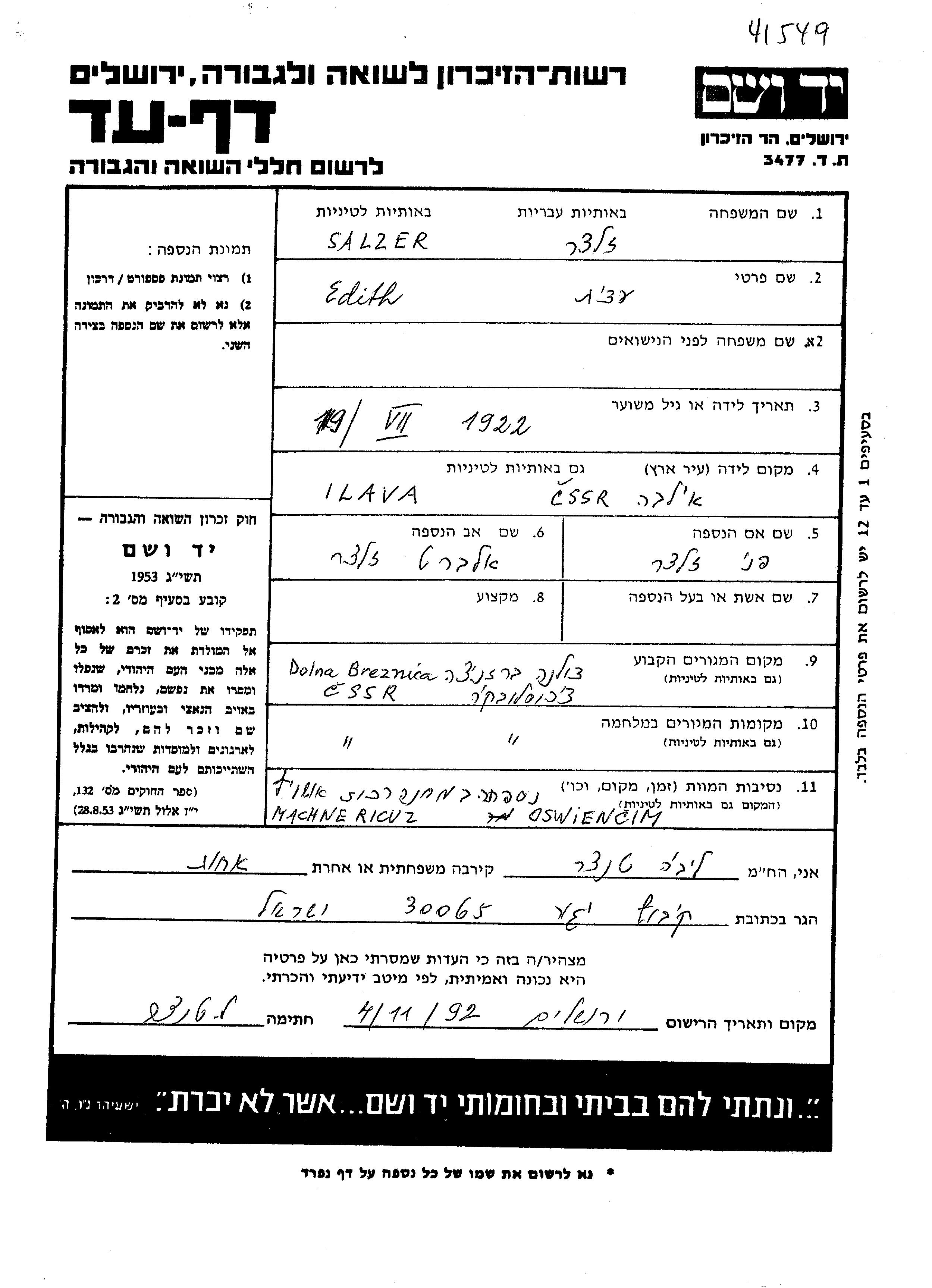 Salzer Edith 1922 Dolna Breznica, Tschechoslowakei Gedenkblatt