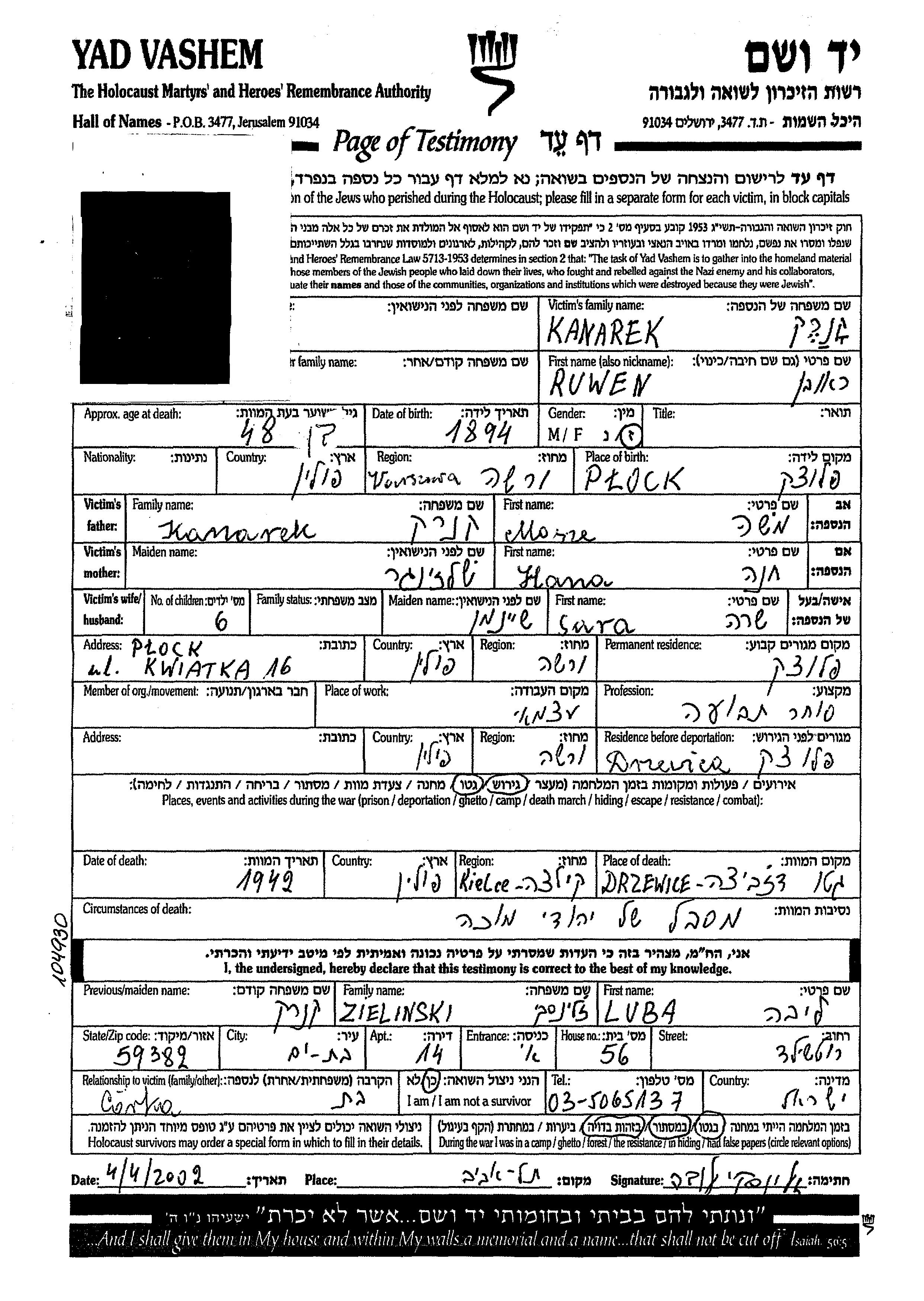 Ruwen Kanarek wurde im Jahr 1894 in Plock, Polen geboren. Er war Getreidehändler/-in. Vor dem Zweiten Weltkrieg lebte er in Plock, Polen.