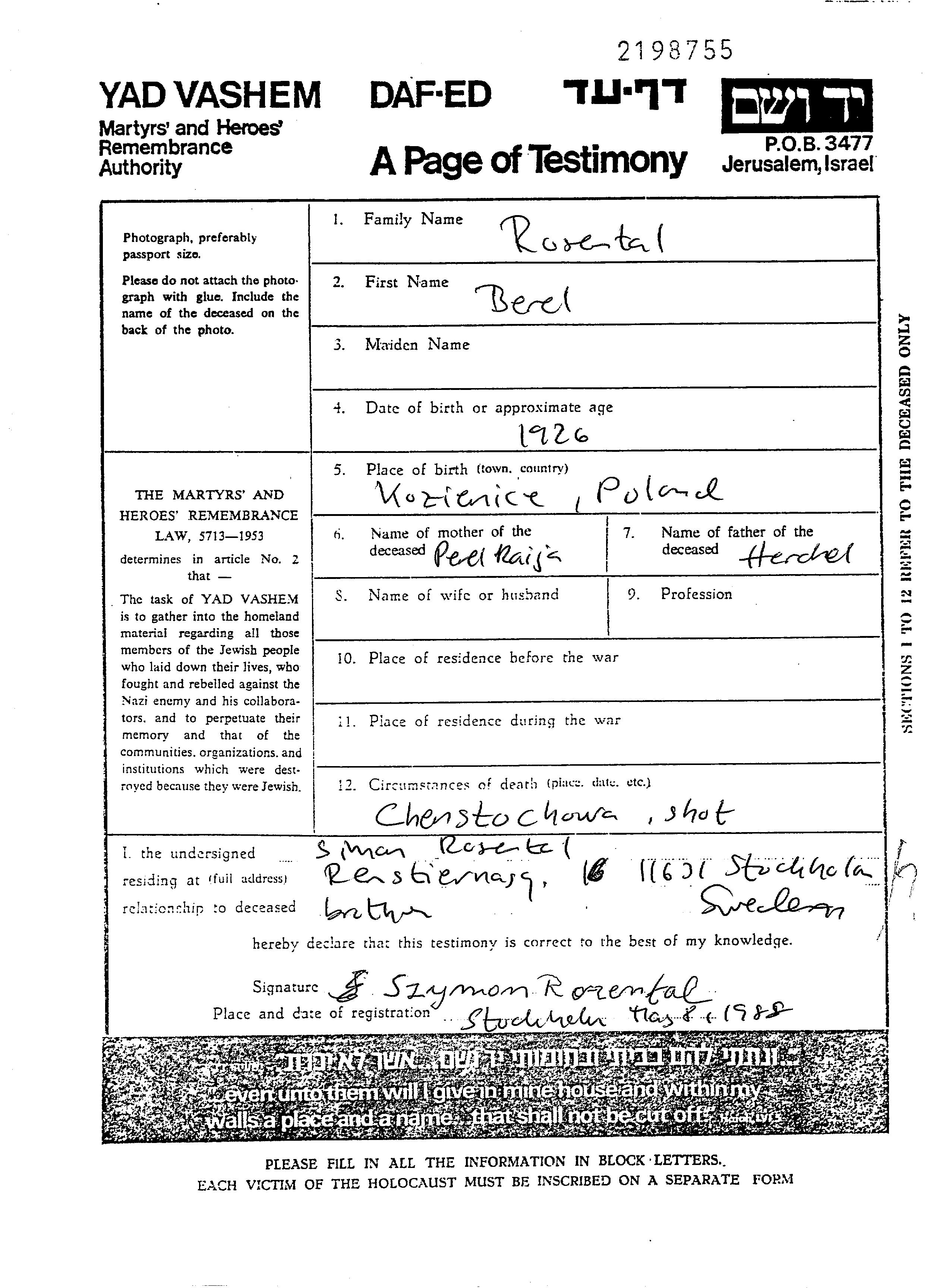 Berl Rosental wurde im Jahr 1926 in Kozienice, Polen geboren. Er war der Sohn von Herchel und Raijsa Perel, geb. Kaufman. Er war Kind.