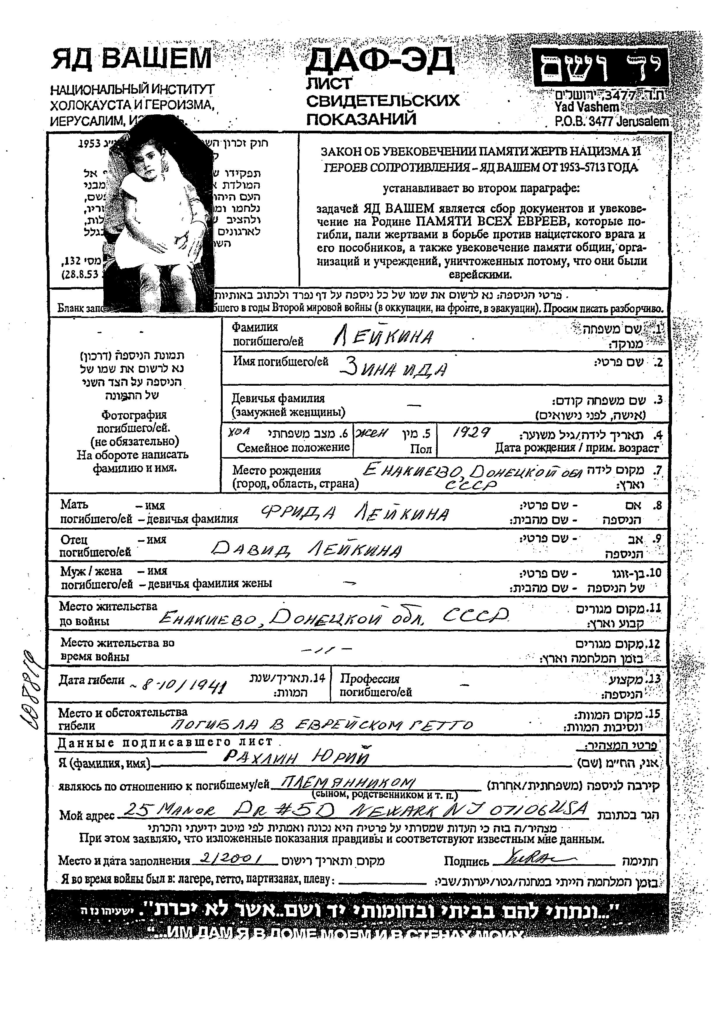 Leikina Zinaida 1929 Yenakievo, Ukraine (UdSSR) Gedenkblatt