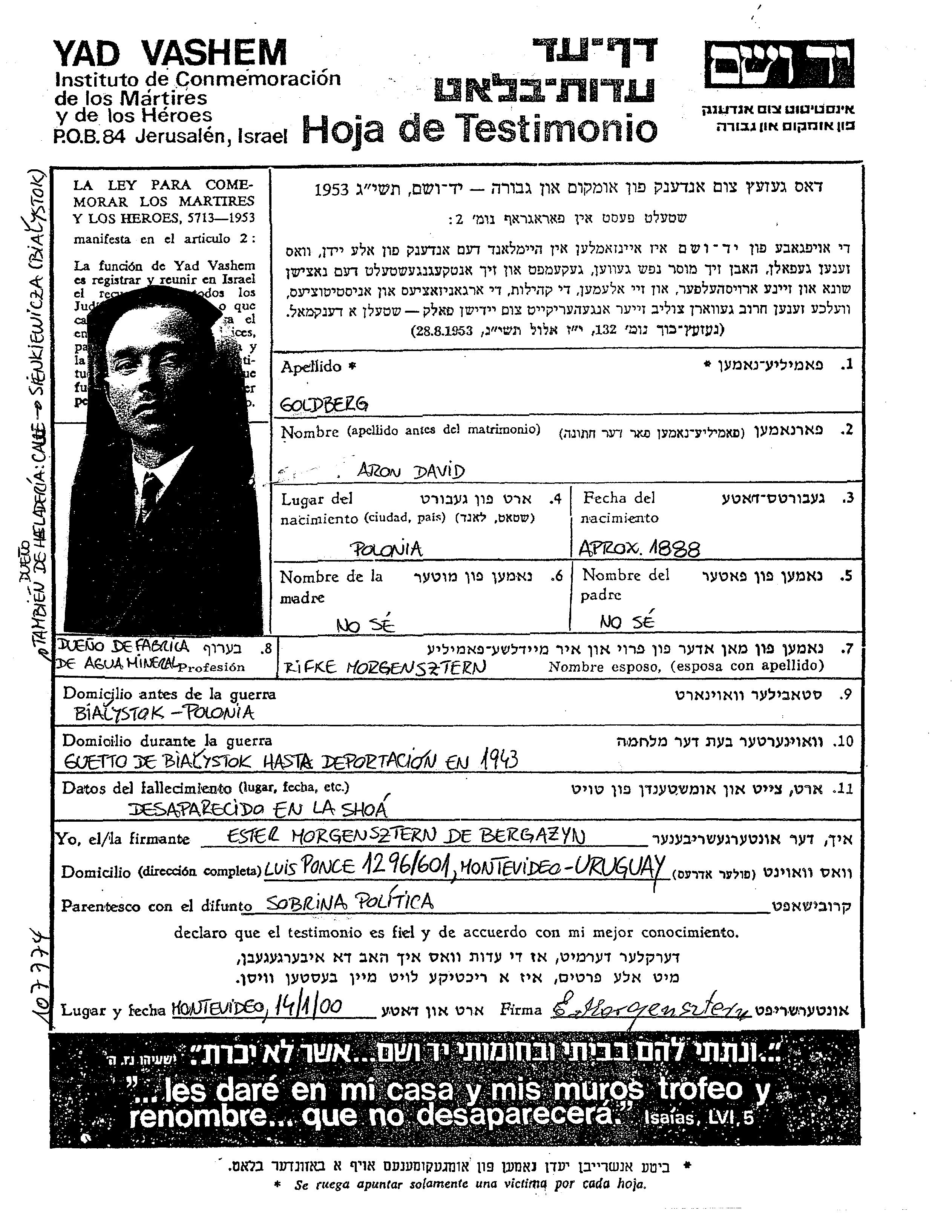Aron David Goldberg wurde im Jahr 1888 in Polen geboren. Er war בית חרושת למים מינרלים. Vor dem Zweiten Weltkrieg lebte er in Bialystok, Polen.