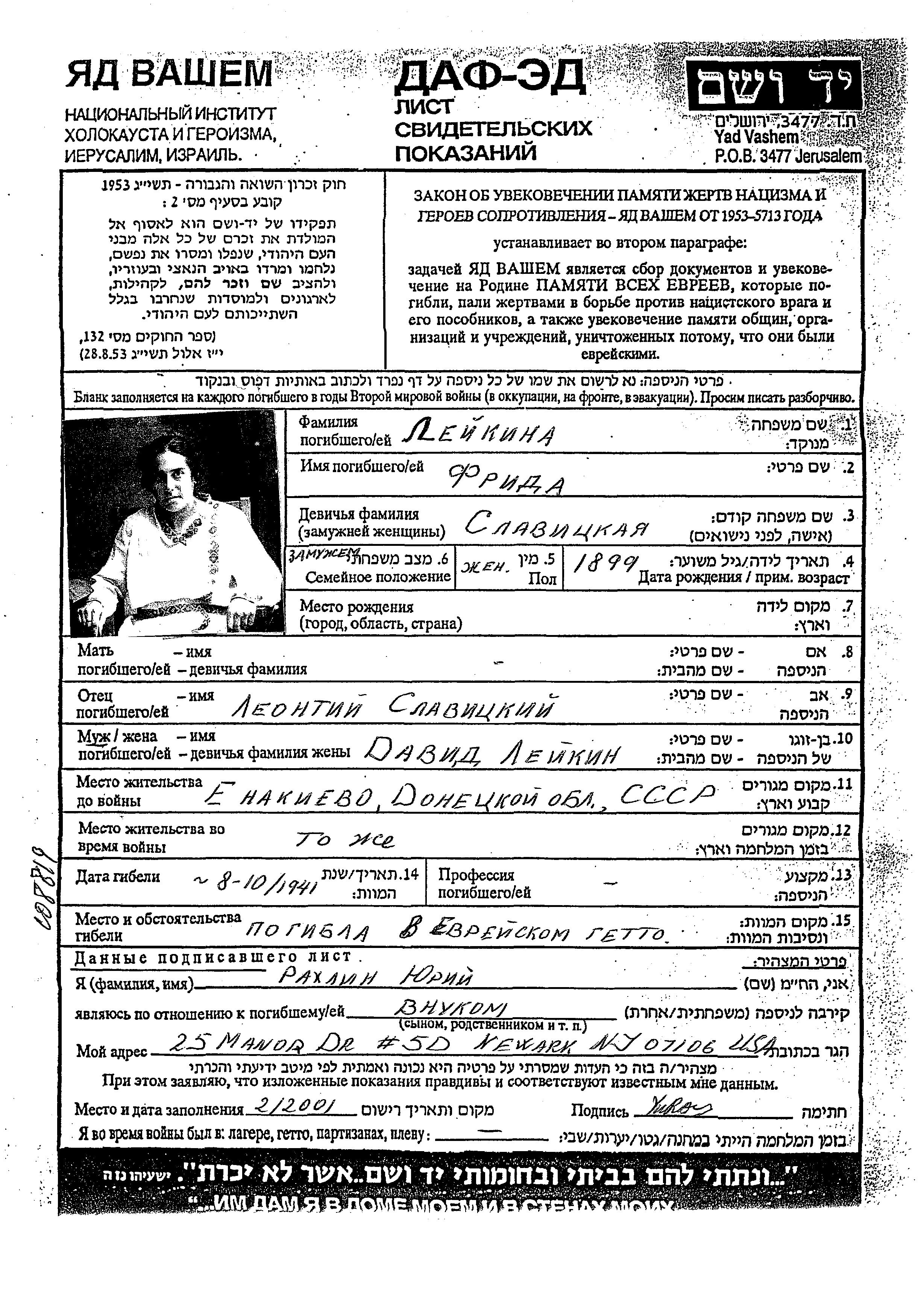 Frida Leikina, geb. Slavitzkaya wurde im Jahr 1899 geboren. Vor dem Zweiten Weltkrieg lebte sie in Ordzhonikidze, Ukraine (UdSSR).