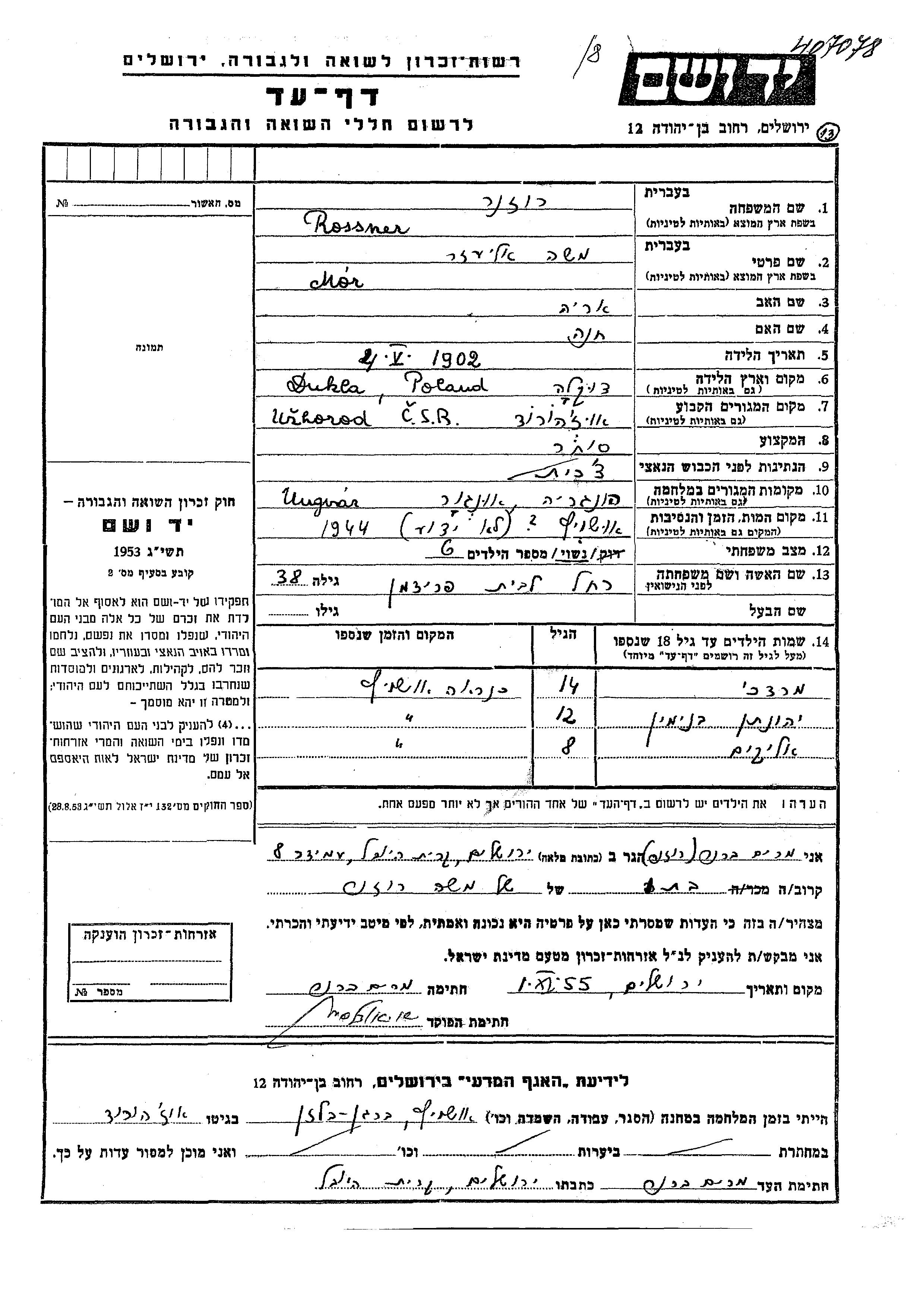Mor Moshe Eliezer Rossner wurde im Jahr 1902 in Dukla, Polen geboren. Er war Kaufmann/-frau. Vor dem Zweiten Weltkrieg lebte er in Uzhorod, Tschechoslowakei.