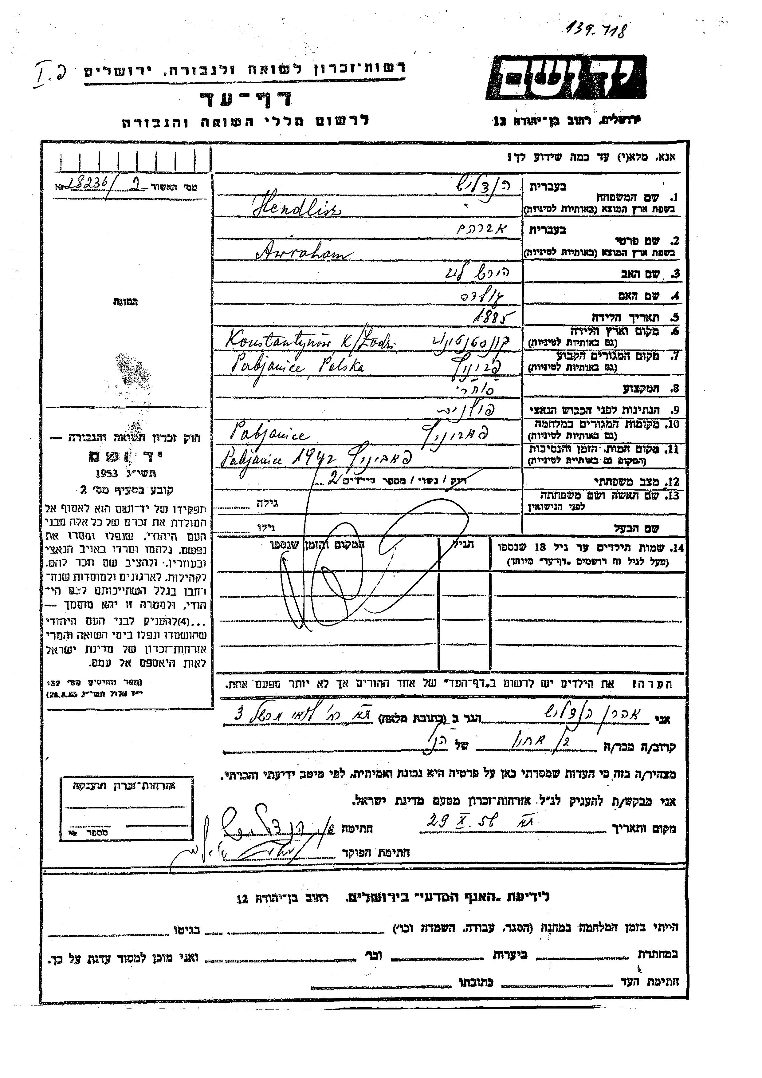 Awraham Hendlisz wurde im Jahr 1885 in Konstantynow, Polen geboren. Er war Kaufmann/-frau. Vor dem Zweiten Weltkrieg lebte er in Pabjanice, Polen.
