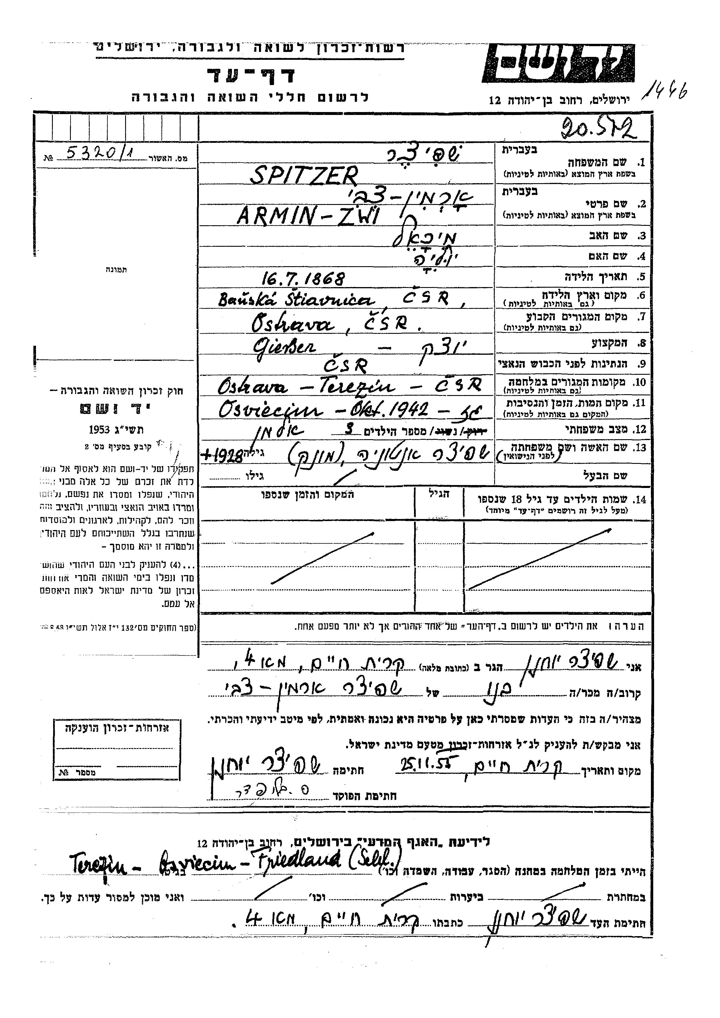 Zwi Armin wurde in der Schoah ermordet. Todesort: Oświęcim, Polen im Jahr 1942.
