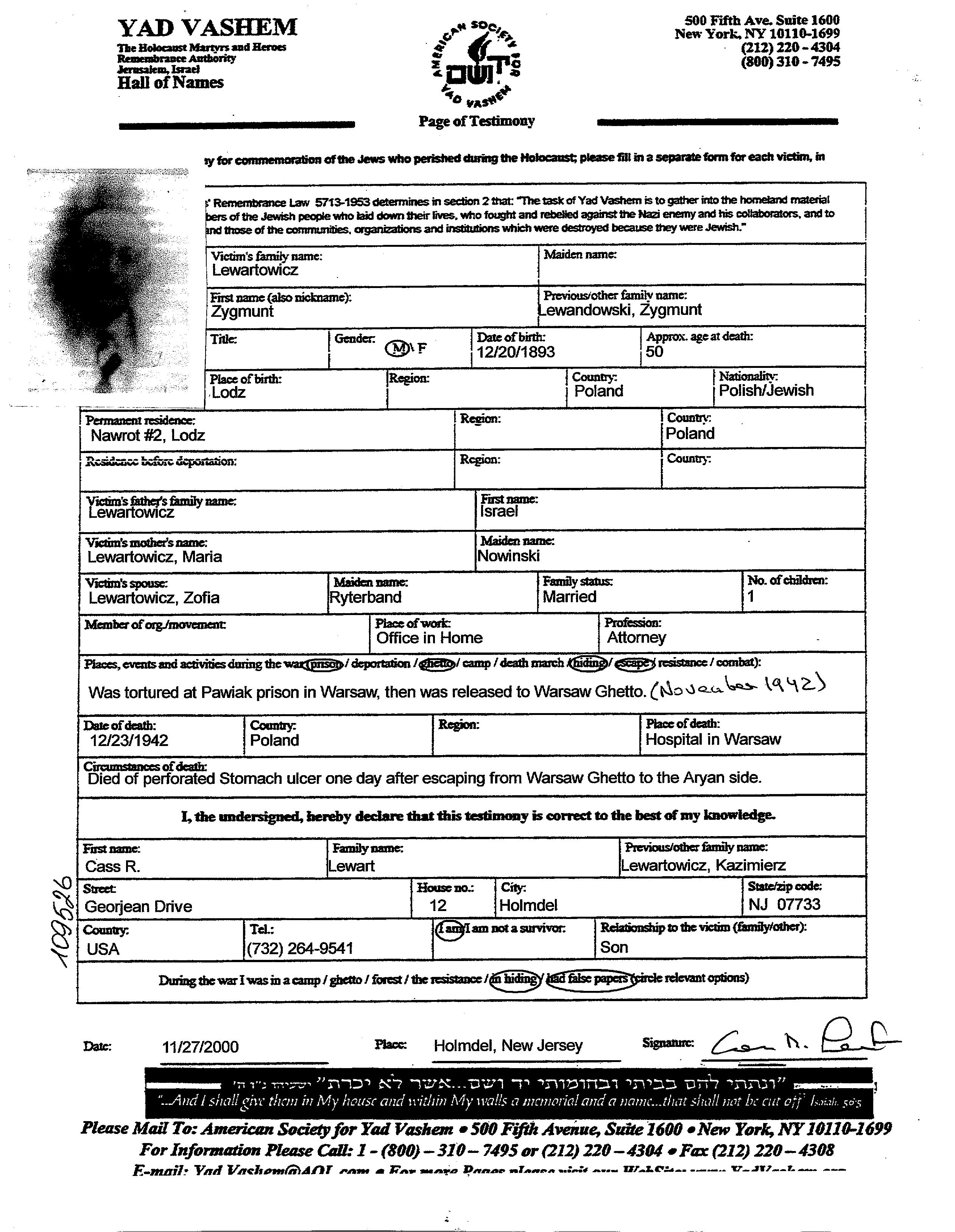 Zygmunt Lewartowicz wurde im Jahr 1893 in Łódź, Polen geboren. Er war Jurist. Vor dem Zweiten Weltkrieg lebte er in Łódź, Polen.