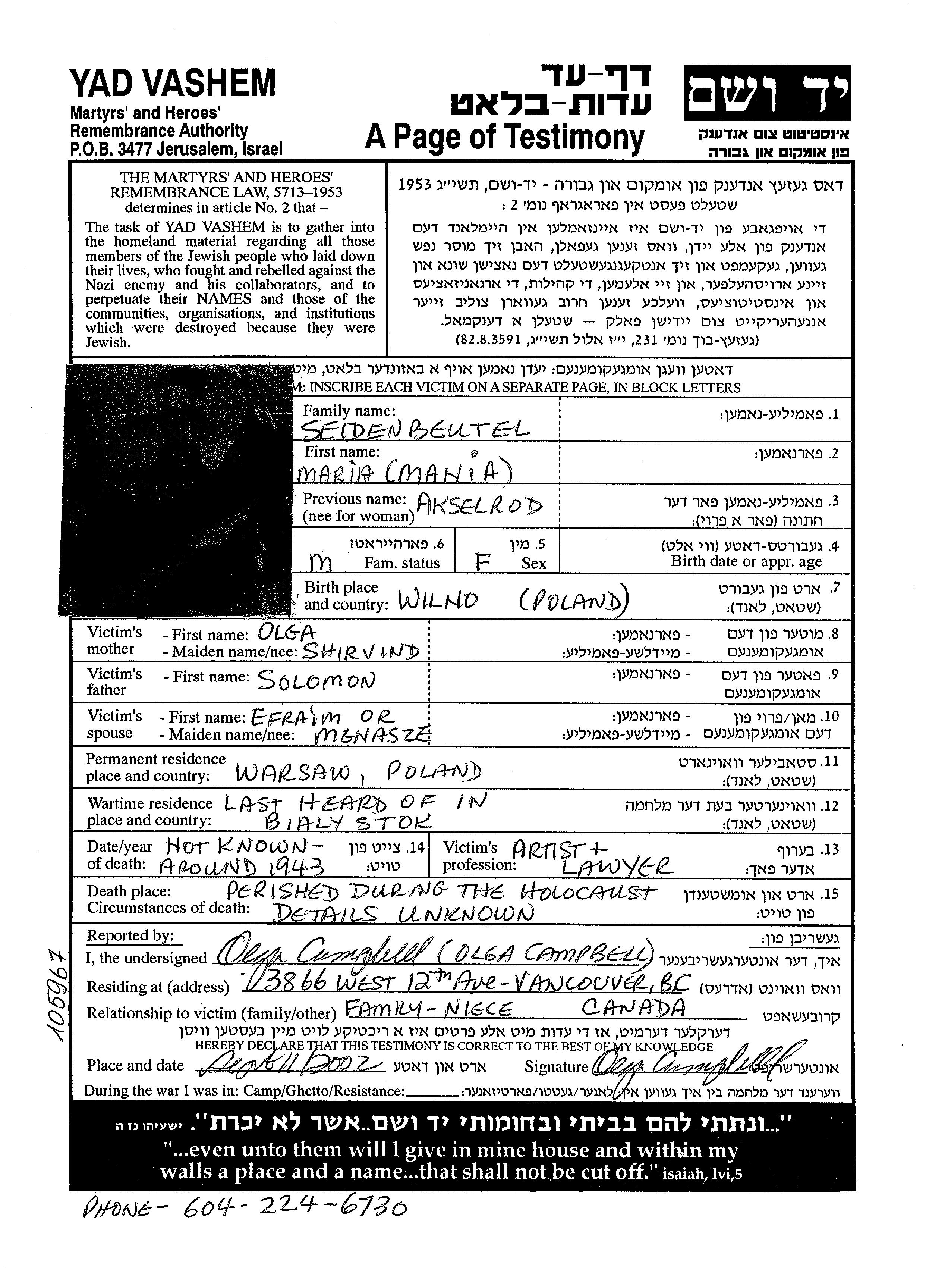 Maria Seidenbeutel, geb. Akselrod wurde in Wilno, Polen geboren. Sie war Rechtsanwalt/rechtsanwältin. Vor dem Zweiten Weltkrieg lebte sie in Warszawa, Polen.