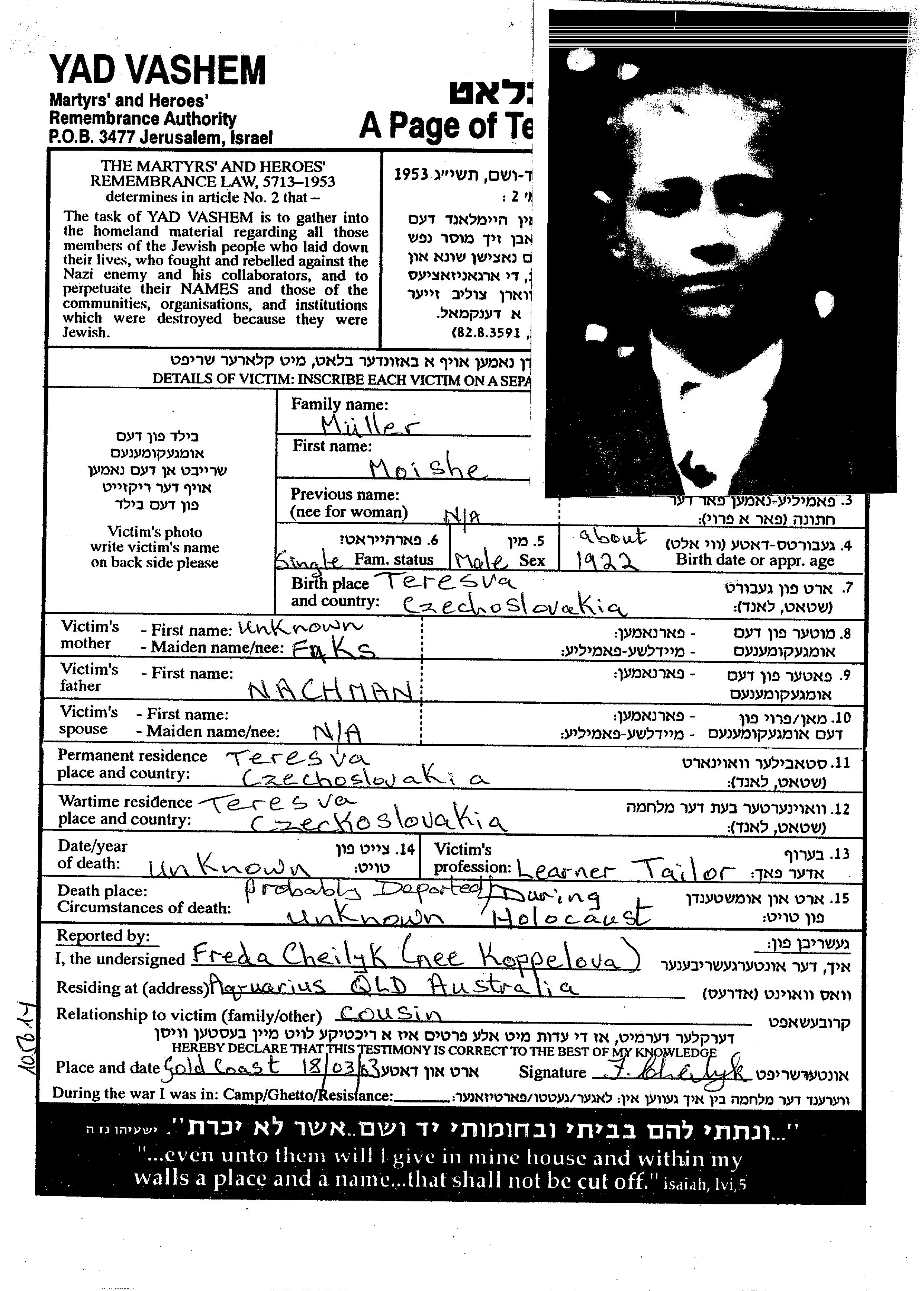 Muller Moishe 1922 Teresva, Tschechoslowakei Gedenkblatt