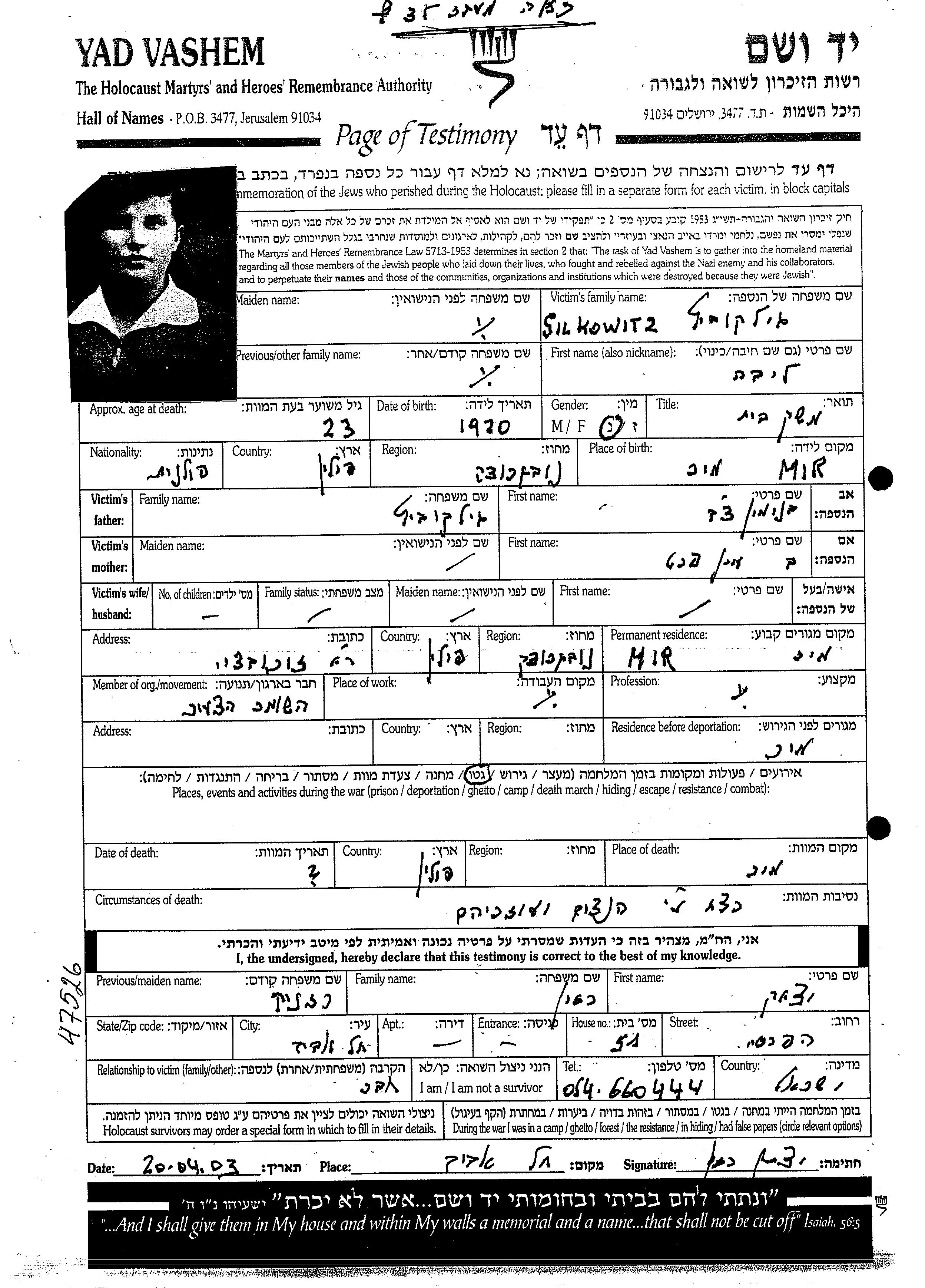 Liba Gilkovich wurde im Jahr 1920 in Mir, Polen geboren. Sie war Haushaltshilfe. Vor dem Zweiten Weltkrieg lebte sie in Mir, Polen.