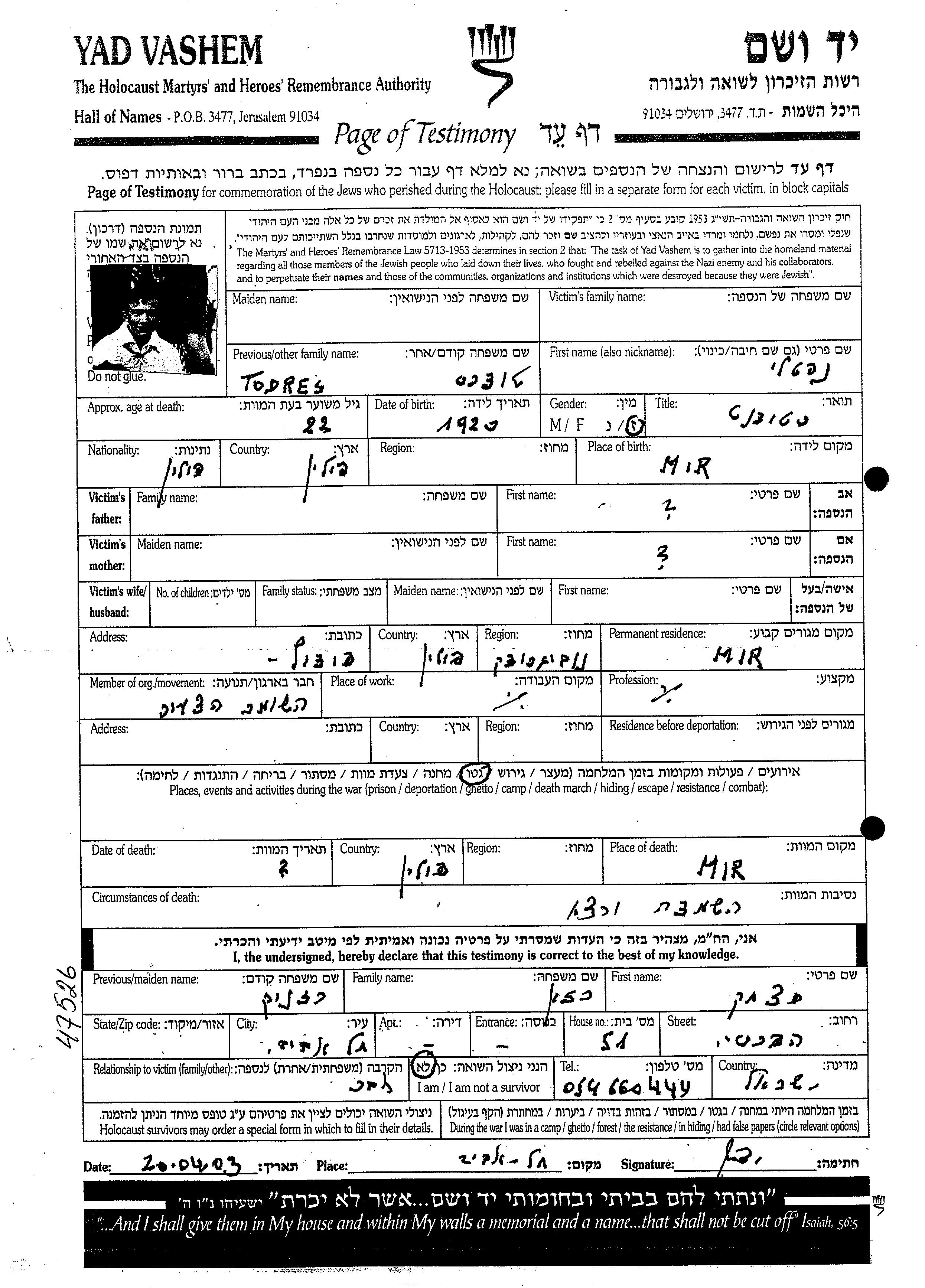 Naftali Todres wurde im Jahr 1920 in Mir, Polen geboren. Vor dem Zweiten Weltkrieg lebte er in Mir, Polen.