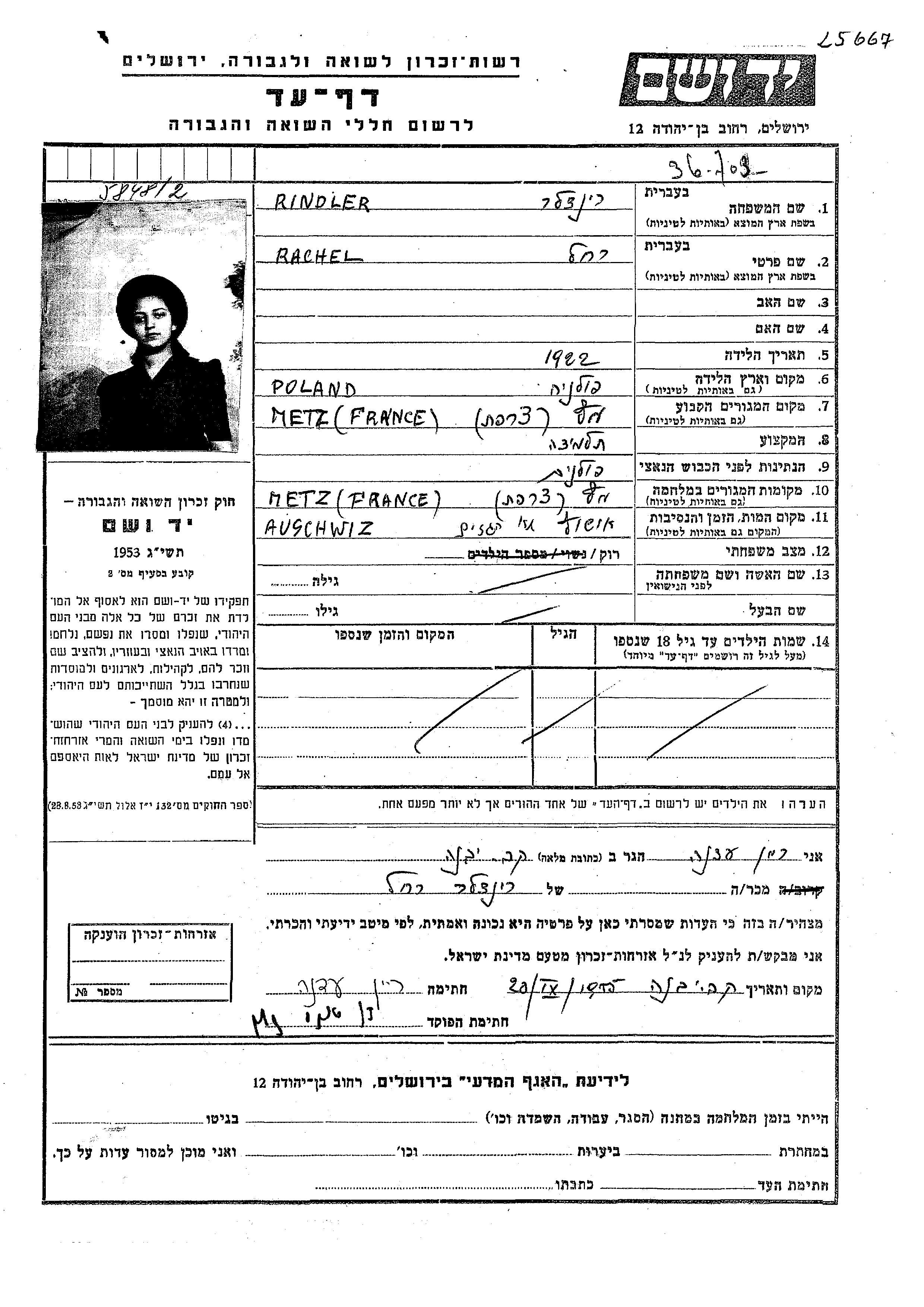 Rachel Rindler wurde im Jahr 1922 in Polen geboren. Sie war Schüler/-in. Vor dem Zweiten Weltkrieg lebte sie in Metz, Frankreich.
