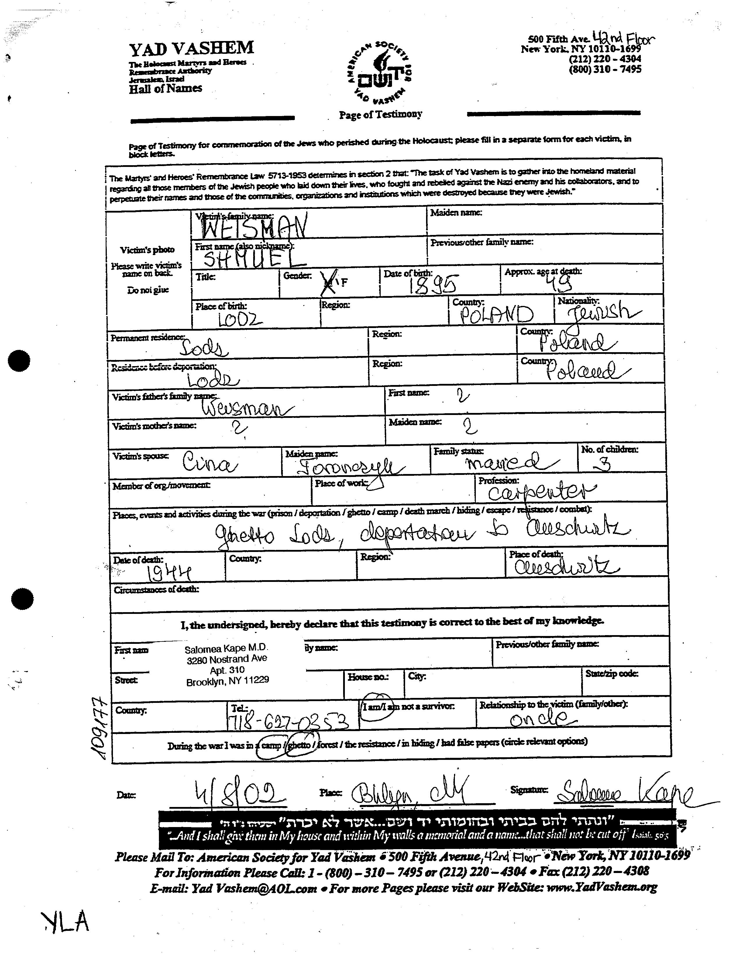 Weisman Shmuel 1895 Lodz, Polen Gedenkblatt