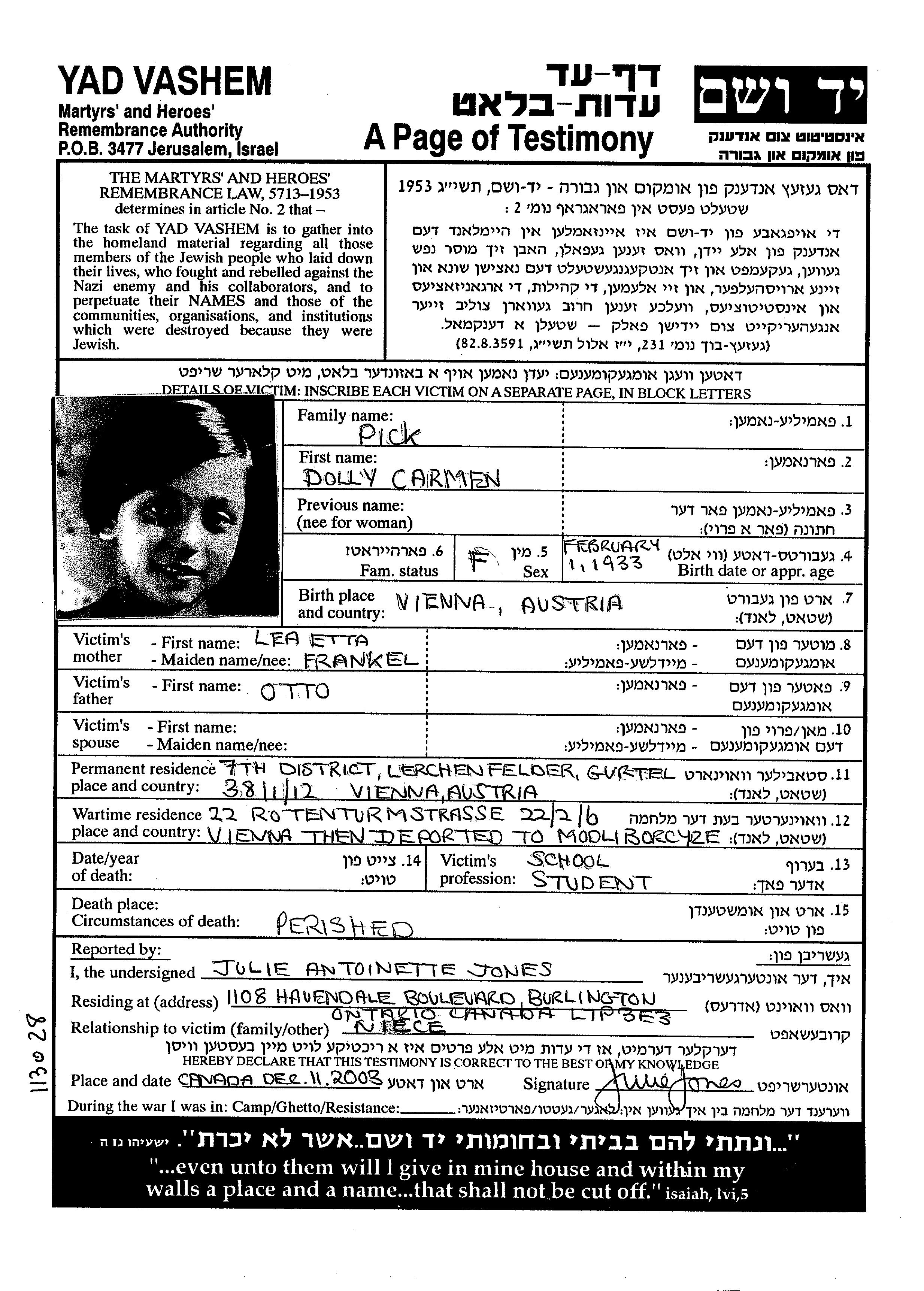 Dolly Carmen Pick wurde im Jahr 1933 in Wien, Österreich geboren. Sie war Schüler/-in. Vor dem Zweiten Weltkrieg lebte sie in Wien, Österreich.