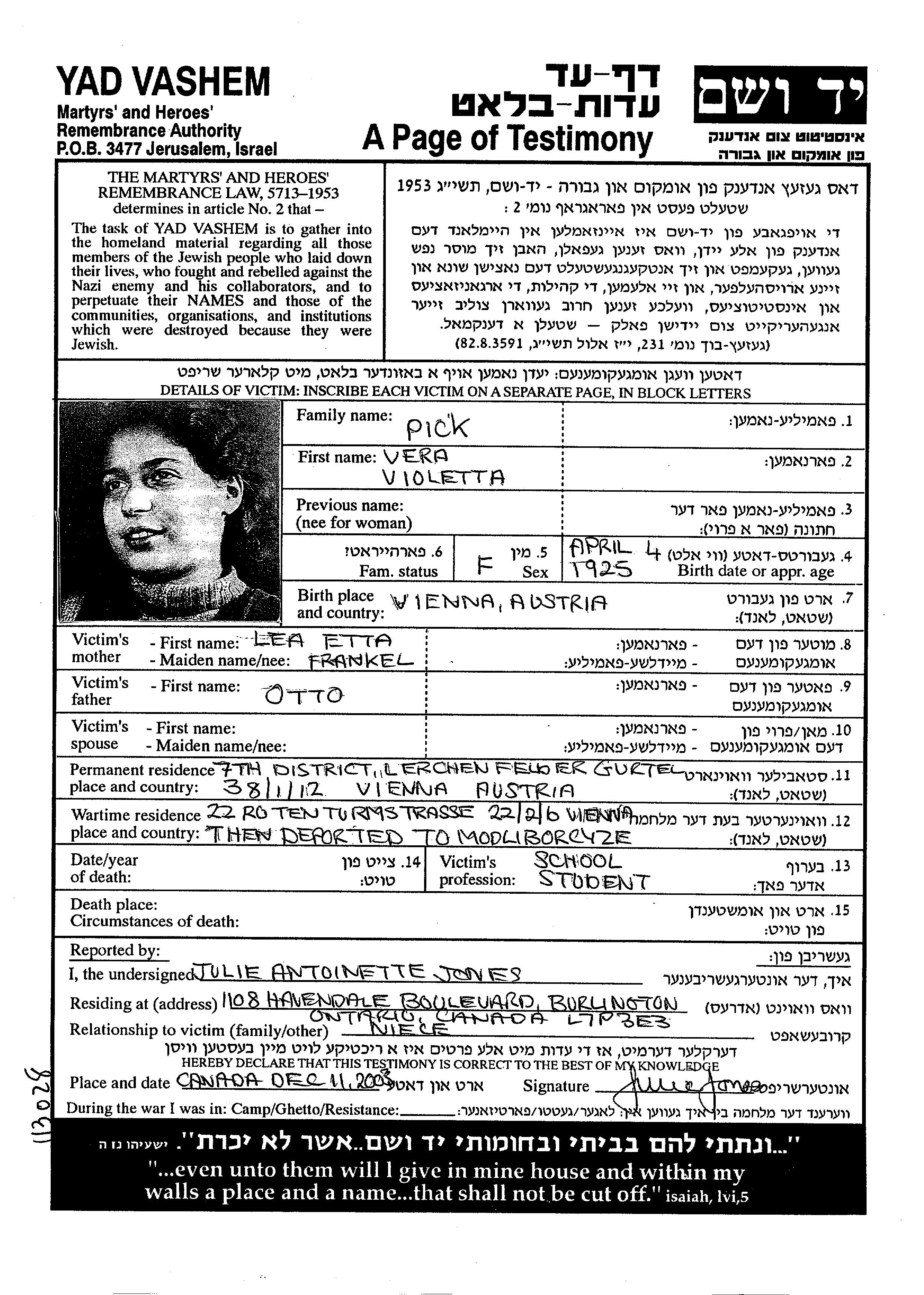 Vera Violette Pick wurde im Jahr 1925 in Wien, Österreich geboren. Sie war Student. Vor dem Zweiten Weltkrieg lebte sie in Wien, Österreich.