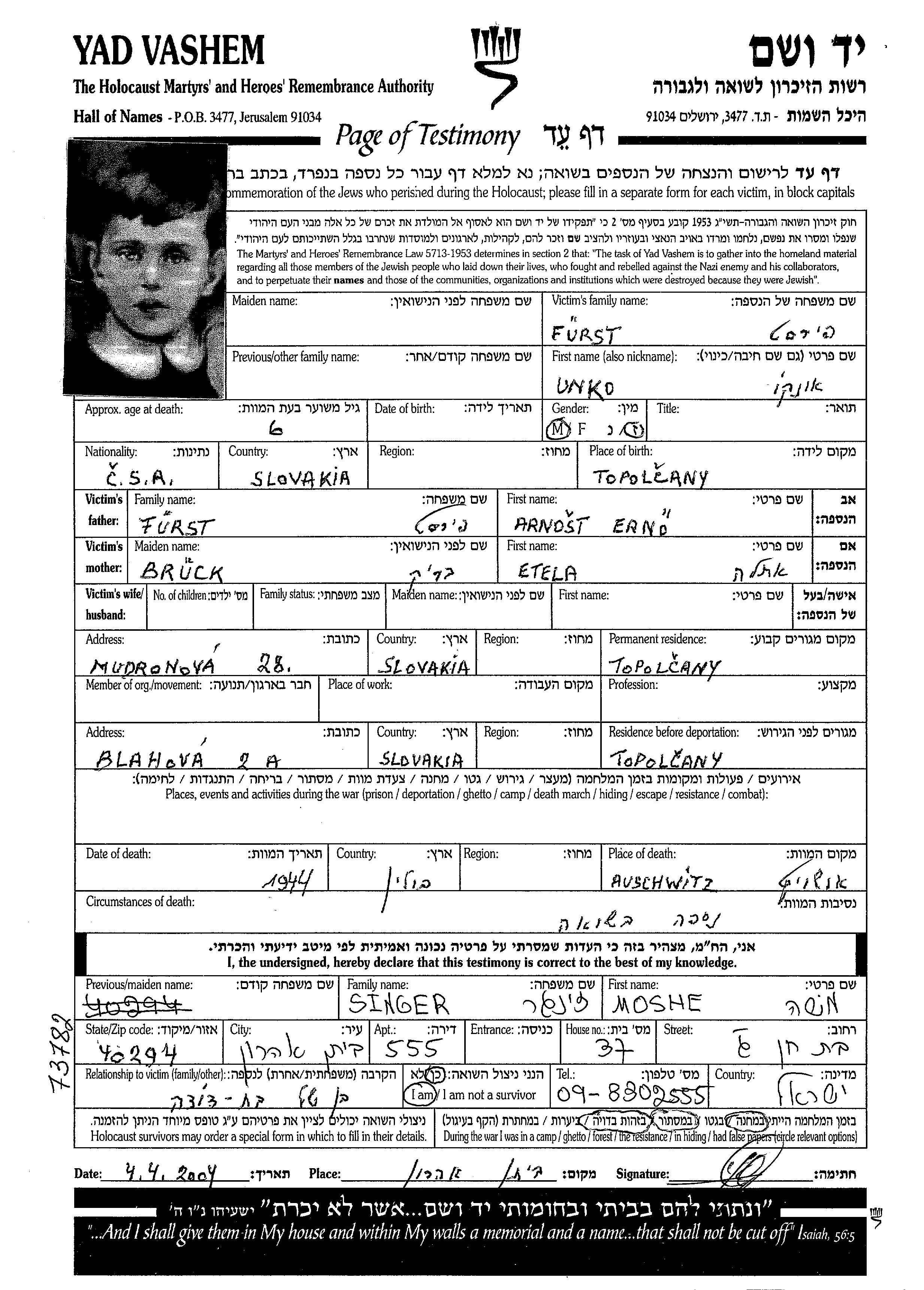 Unko Furst wurde im Jahr 1938 in Topolcany, Tschechoslowakei geboren. Vor dem Zweiten Weltkrieg lebte er in Topolcany, Tschechoslowakei.
