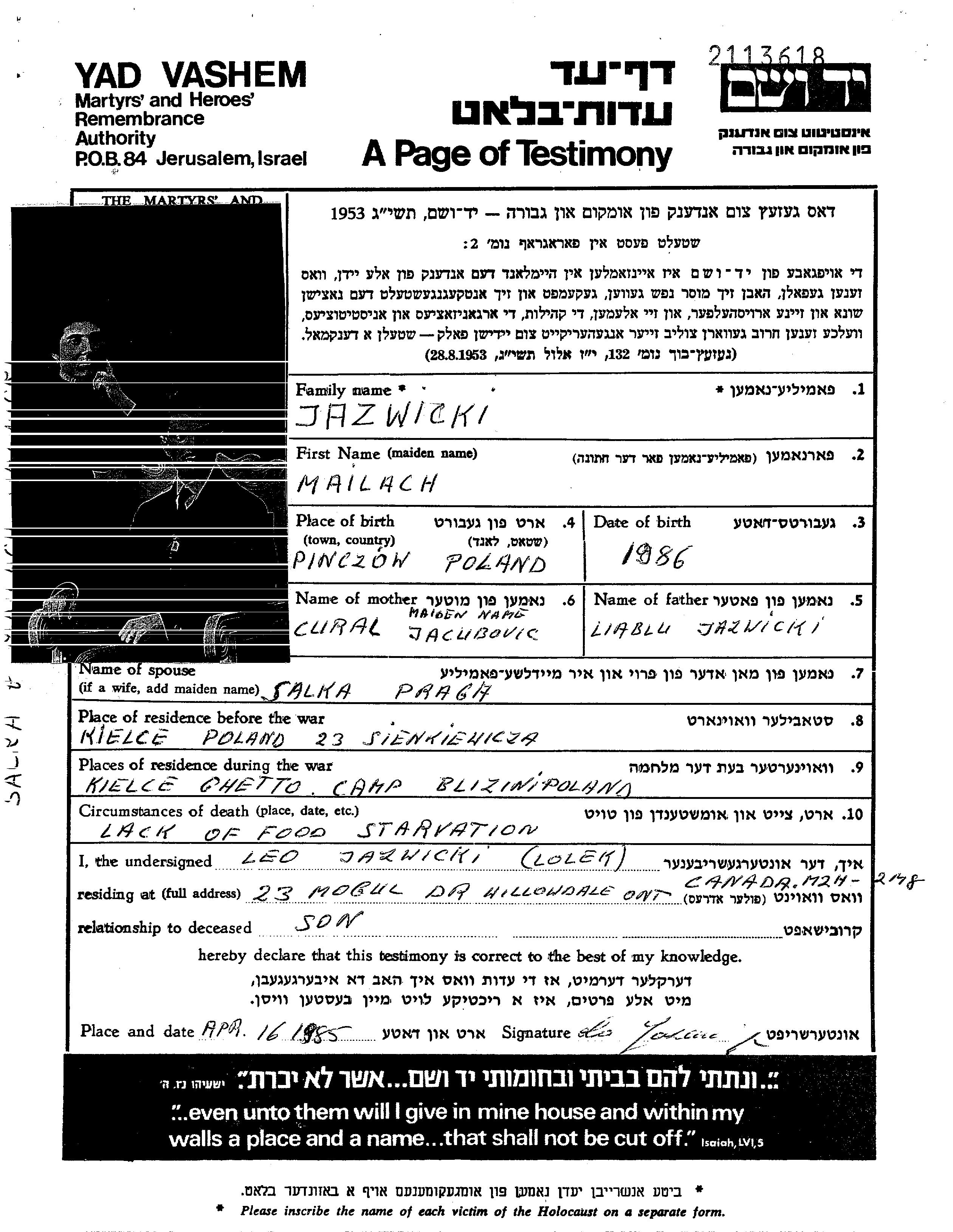 Mailach Jazwicki wurde im Jahr 1886 in Pinczow, Polen geboren. Vor dem Zweiten Weltkrieg lebte er in Kielce, Polen.