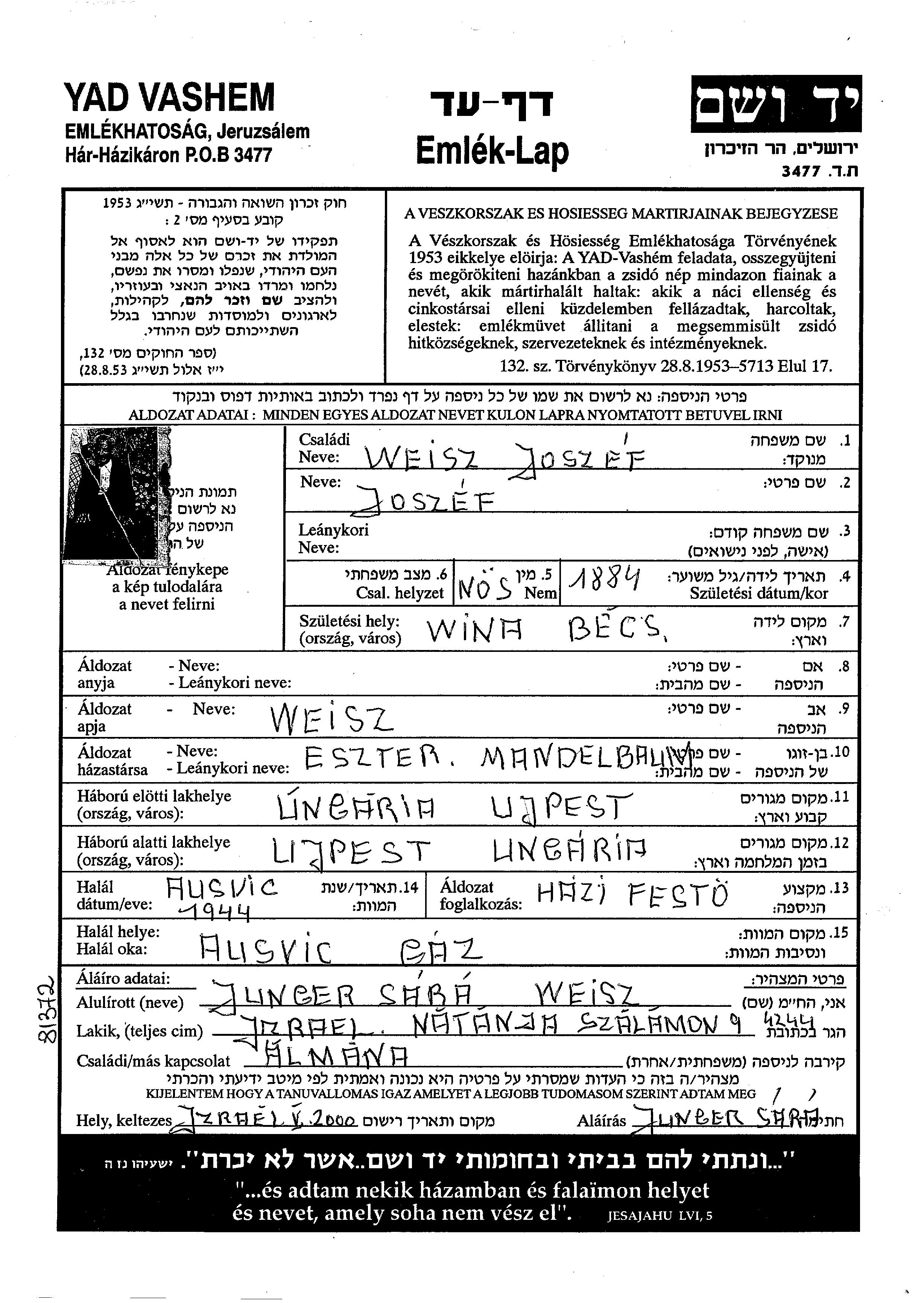 Joszef Weisz wurde im Jahr 1884 in Wien, Österreich geboren. Vor dem Zweiten Weltkrieg lebte er in Ujpest, Ungarn.
