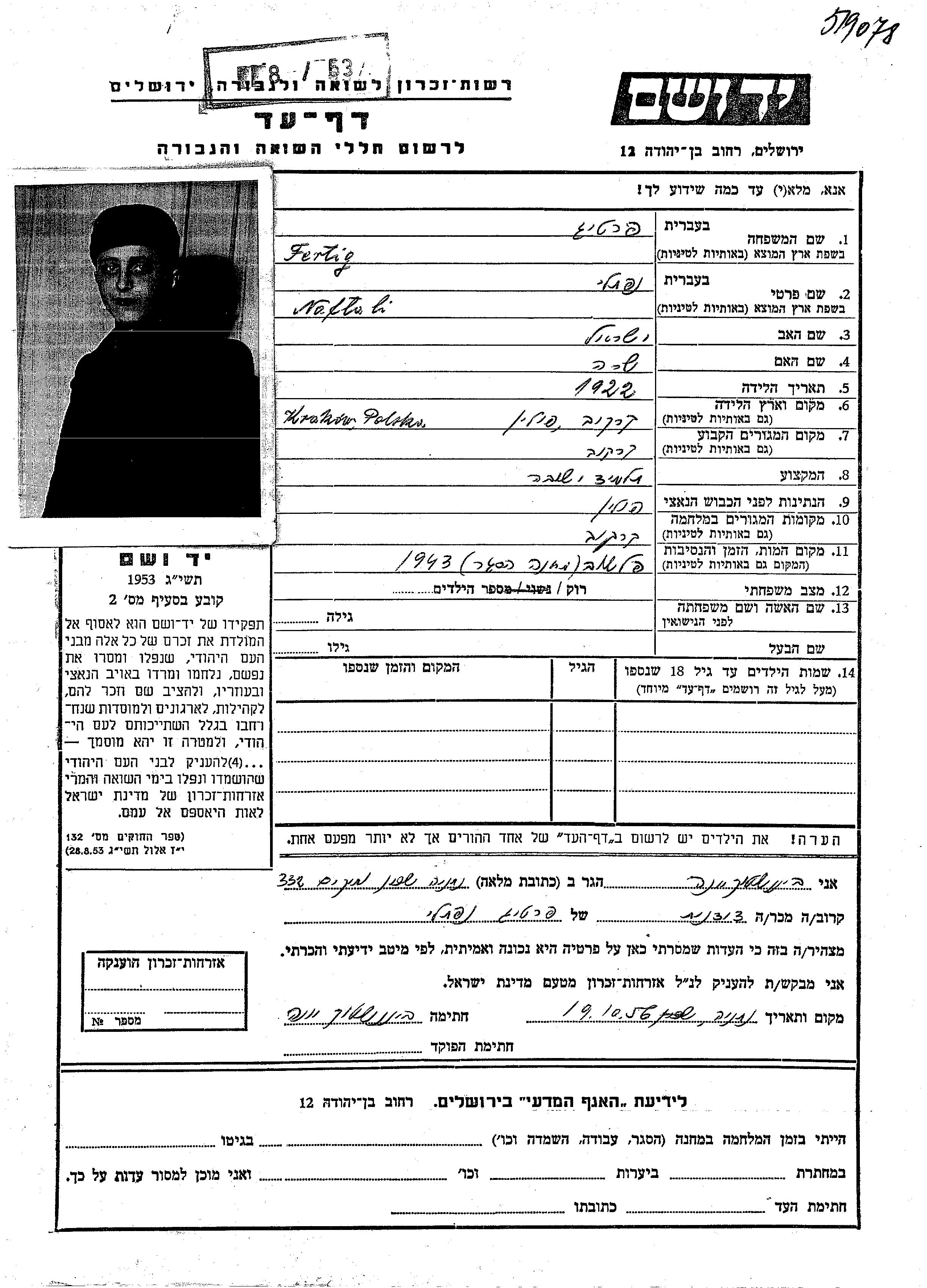Naftali wurde in der Schoah ermordet. Todesort: Plaszow, Polen im Jahr 1943.