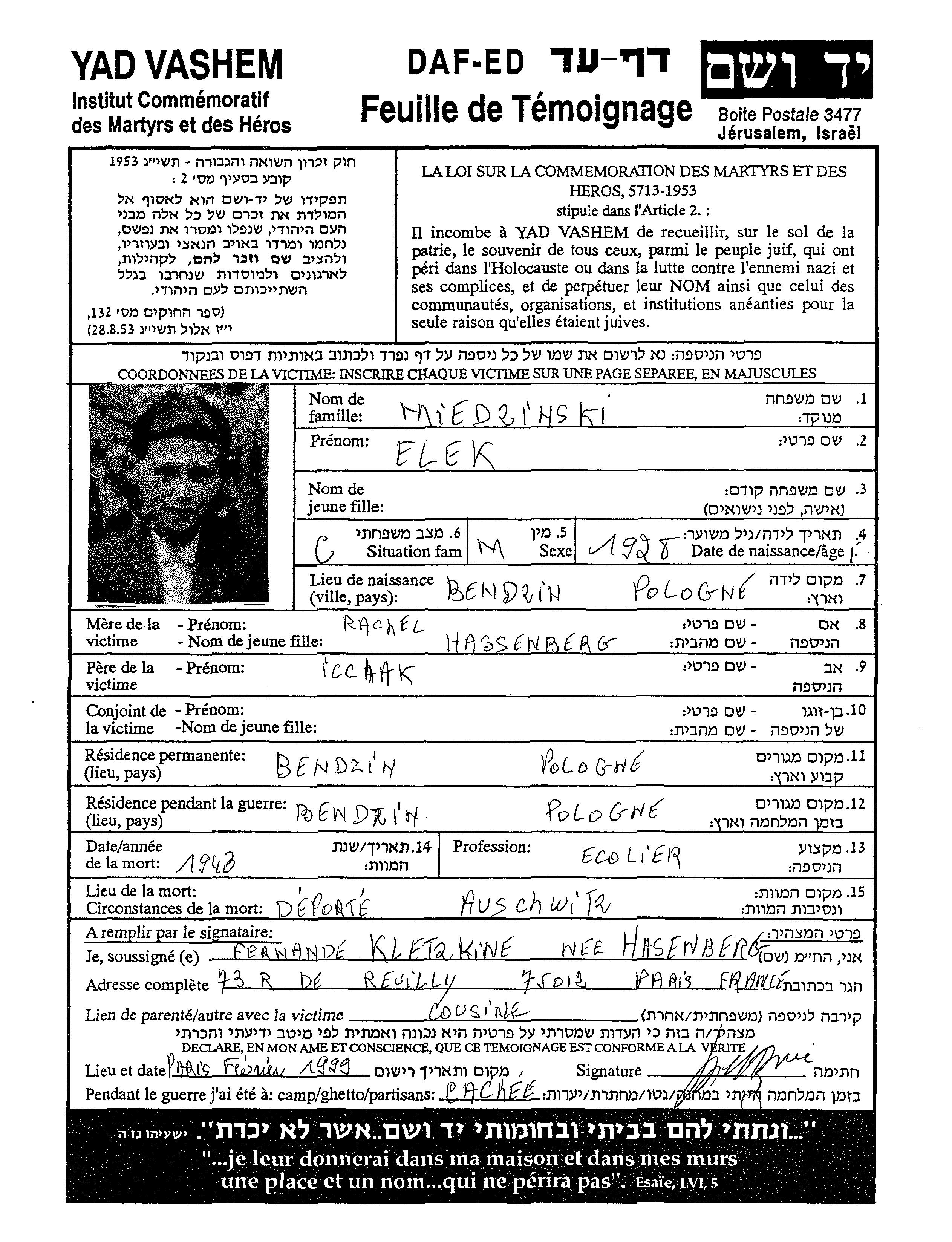 Elek Miedzinski wurde im Jahr 1928 in Będzin, Polen geboren. Er war Schüler/-in. Vor dem Zweiten Weltkrieg lebte er in Będzin, Polen.