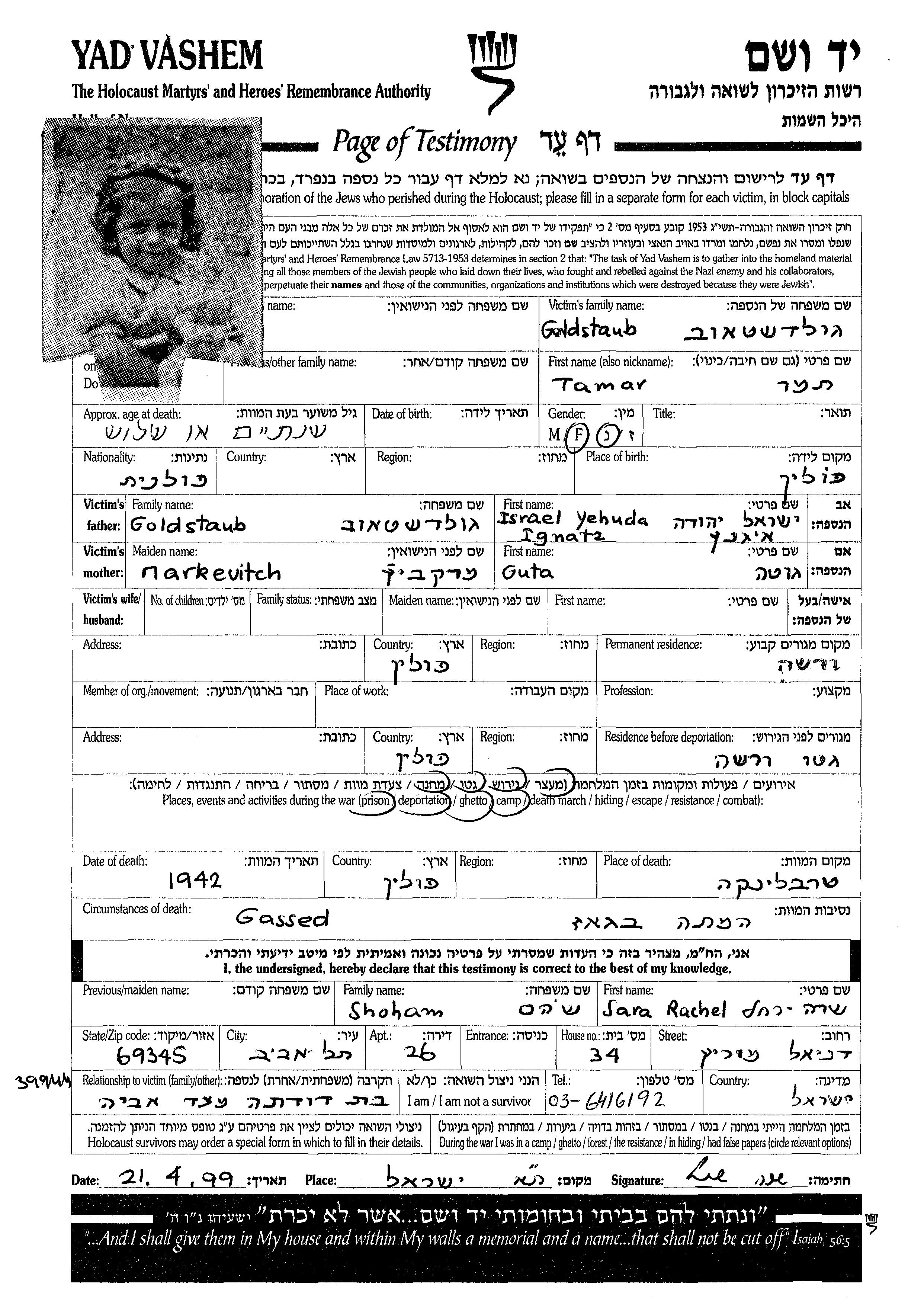 Goldsztaub Tamar Warszawa, Polen Gedenkblatt