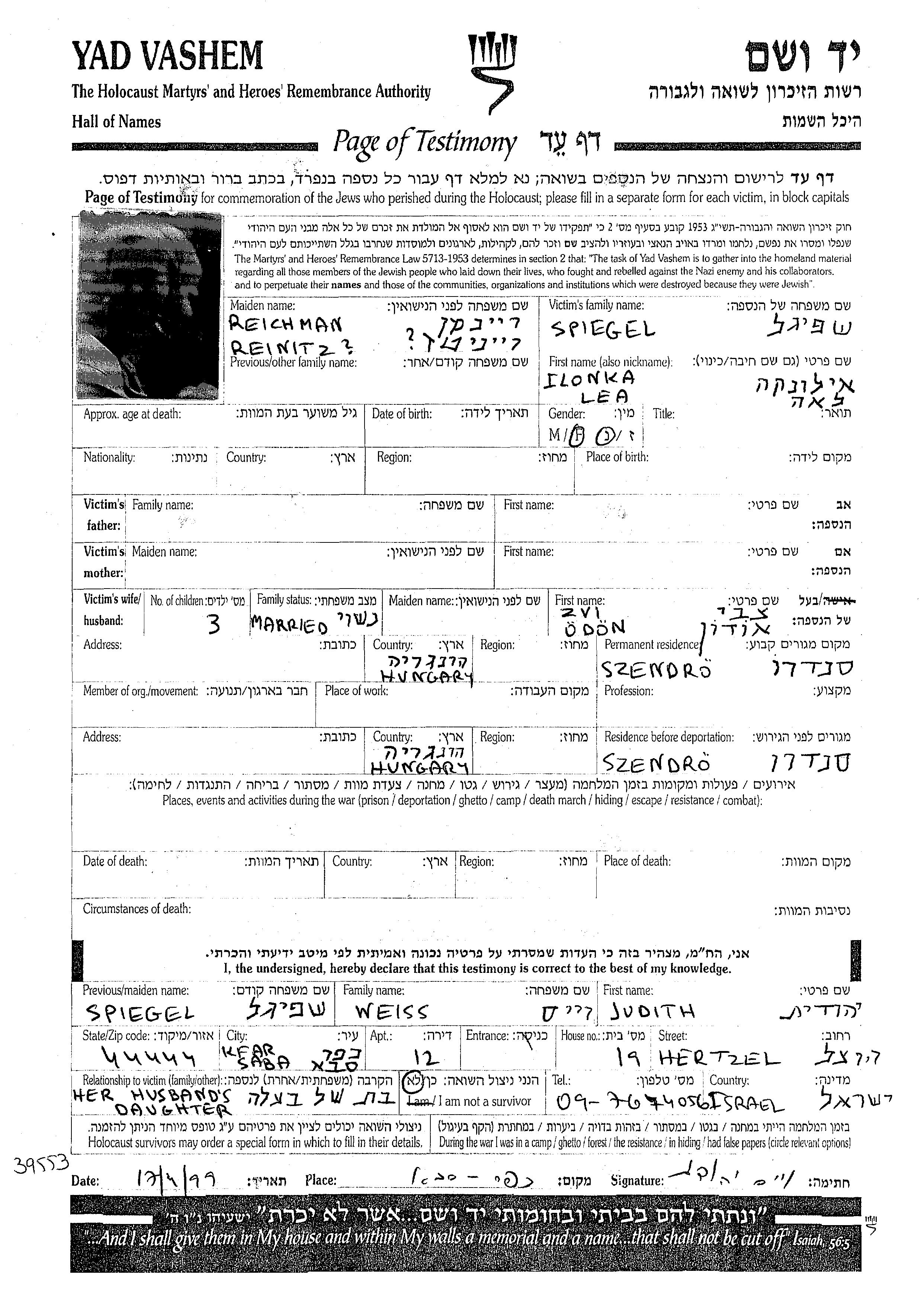 Shpigel Lea Ilonka Szendro, Ungarn Gedenkblatt