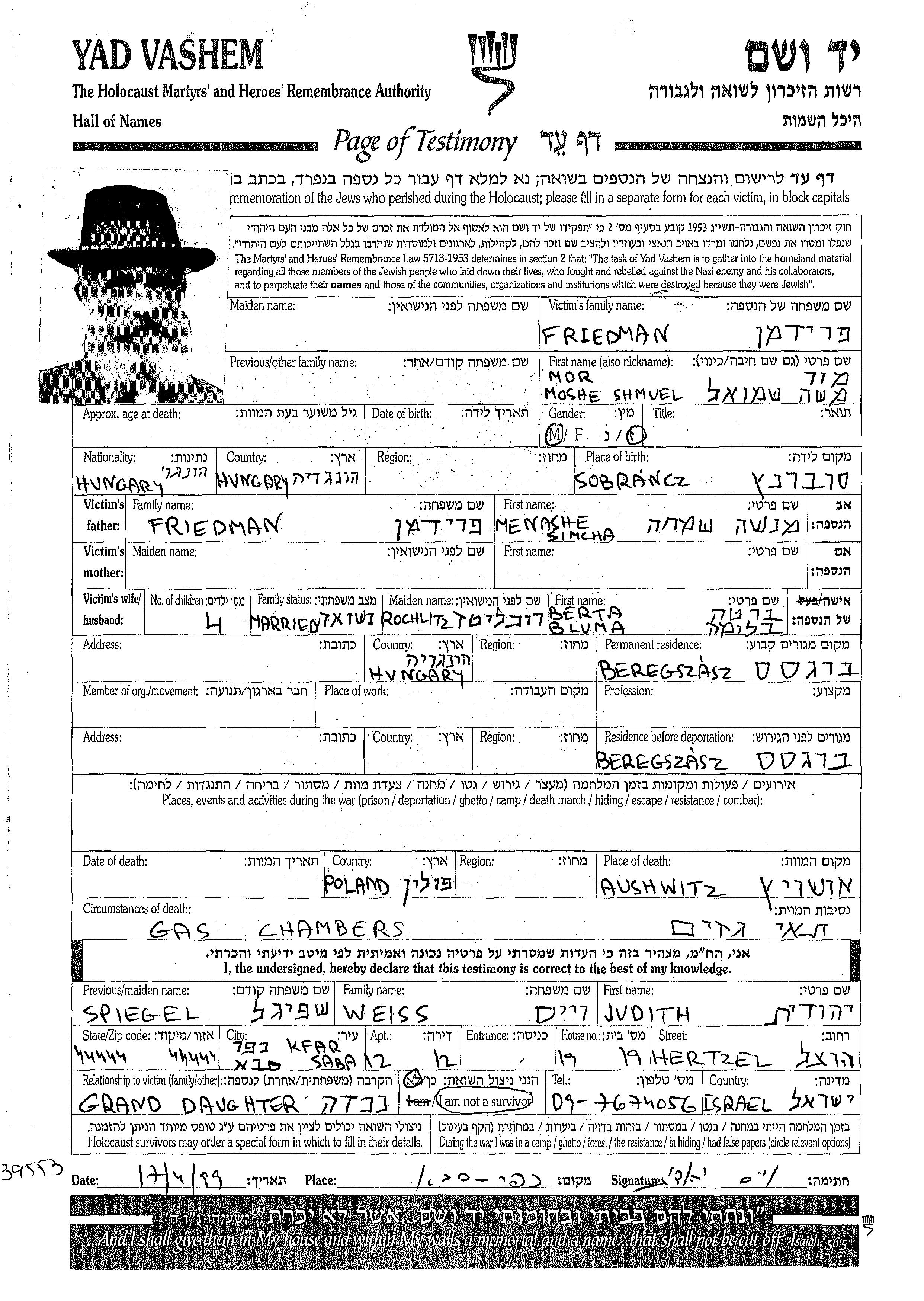Mor Moshe Shmuel wurde in der Schoah ermordet. Todesort: Auschwitz, Polen.