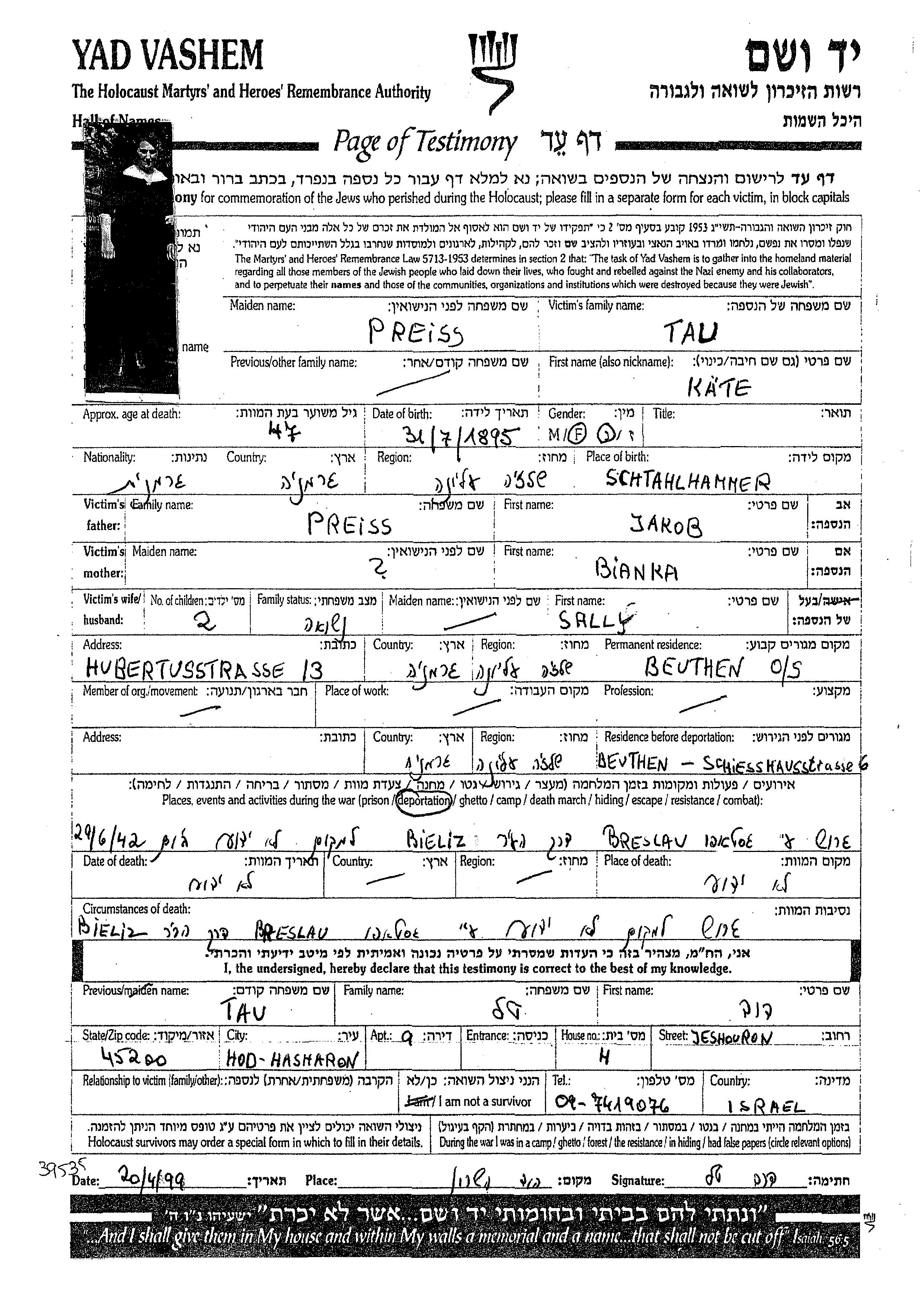 Käte Tau, geb. Preiss wurde im Jahr 1875 in Kalety, Polen geboren. Vor dem Zweiten Weltkrieg lebte sie in Beuthen, Deutsches Reich.