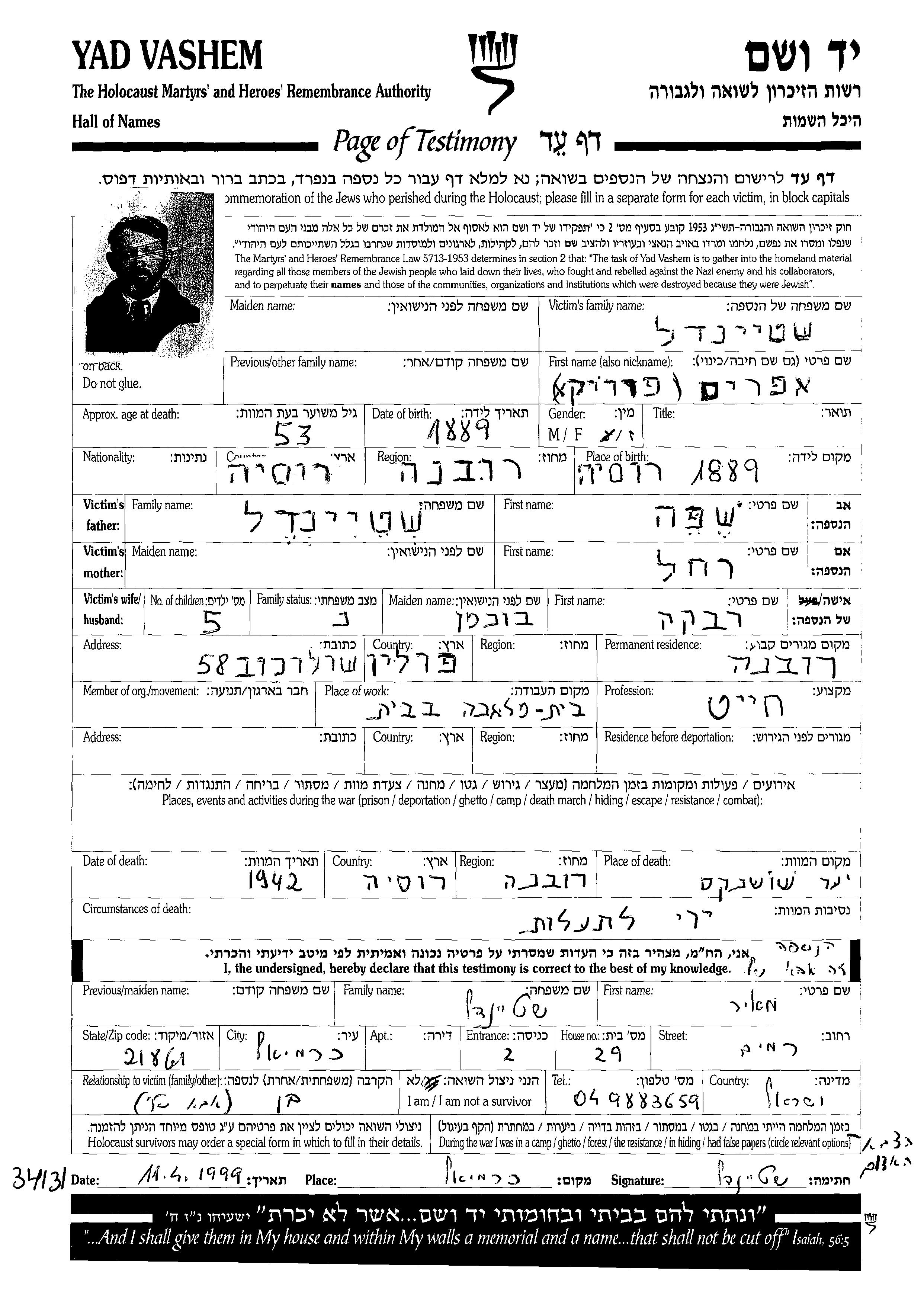 Efraim Shteindel wurde im Jahr 1889 in Rowne, Polen geboren. Er war Schneider. Vor dem Zweiten Weltkrieg lebte er in Rowne, Polen.